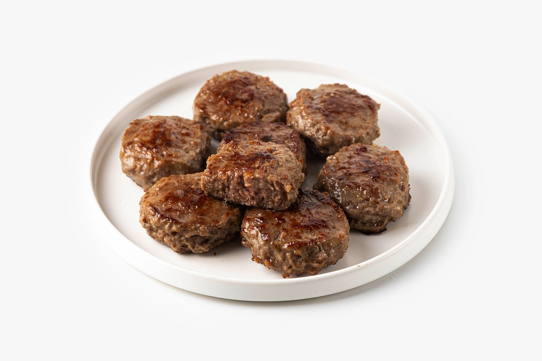 Миниатюрные котлеты с нежным вкусом и простым составом. Их основу составляет свежая говядина. Чтобы котлеты держали форму, мы добавили немного бездрожжевого хлеба. А чтобы мягко подчеркнуть вкус — щепотку соли, перца и сухого лука. Котлеты получатся особенно сочными, если их быстро обжарить до румяной корочки, а затем отправить в разогретую до 100ºС духовку на 25 минут. Перед обжаркой советуем дать котлетам подтаять при комнатной температуре — хватит одного часа.