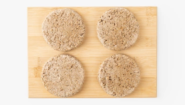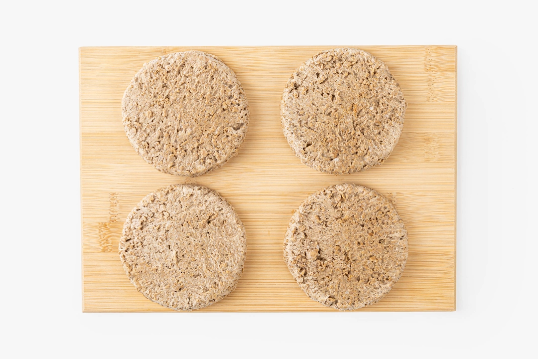 Сочные котлеты с плотной текстурой и выраженным вкусом, который напоминает мясной, хотя продукт полностью растительный. В составе — смесь соевого, горохового и рисового белков, придающих питательность, и специально подобранные масла (подсолнечное, кокосовое и льняное), которые обеспечивают сочность и сбалансированный вкус. Лёгкий аромат специй и румяная корочка после обжарки делают котлеты универсальными: их можно использовать для бургеров, подавать с овощами или гарниром. В нашей рецептуре нет усилителей вкуса и искусственных ароматизаторов.