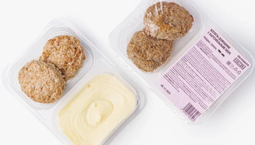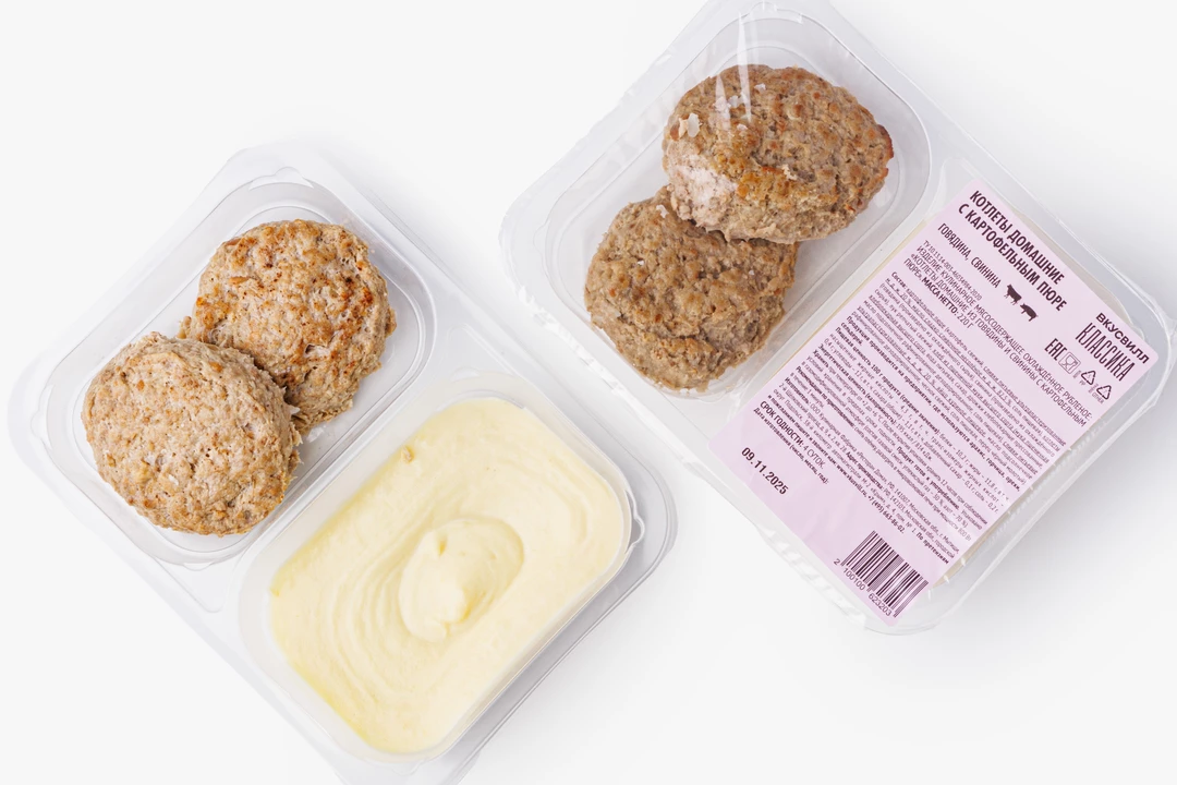 Картофельное пюре приготовлено из свежего картофеля с добавлением сливок и сливочного масла. Котлеты из свино-говяжего фарша по домашнему рецепту. Без консервантов, усилителей вкуса и ароматизаторов