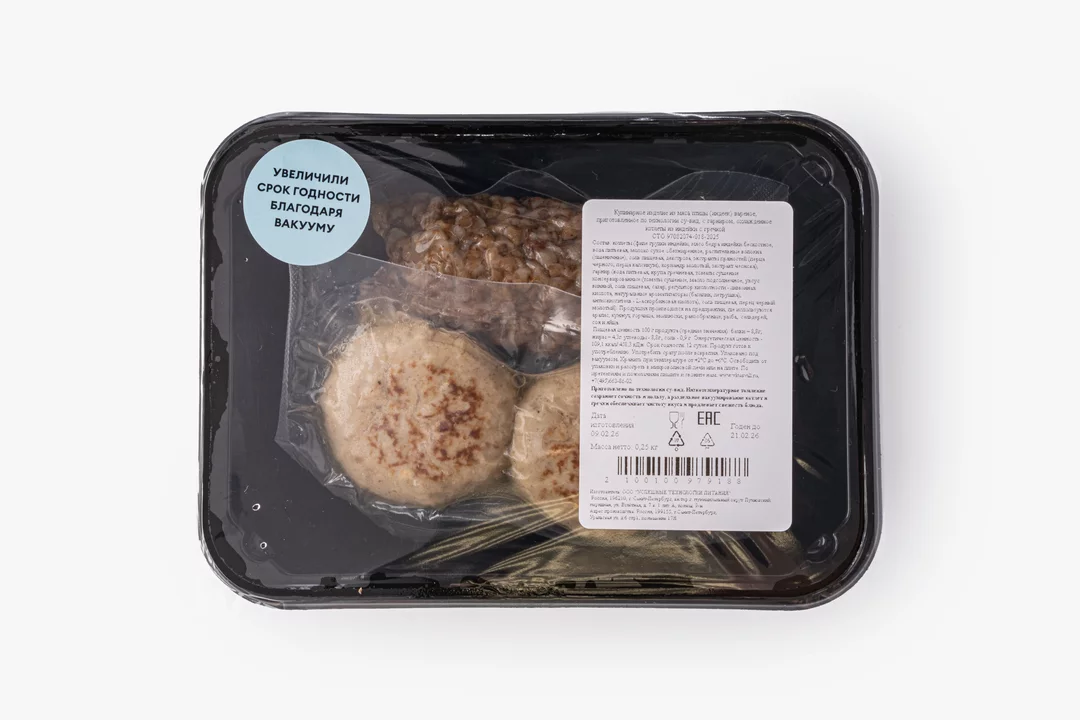 Нежные котлеты из филе и бедра индейки с рассыпчатой гречкой — сытное сочетание, напоминающее о домашней кухне. Мясо индейки сохраняет сочность, а гречневый гарнир с вялеными томатами и травами приобретает насыщенный вкус с нотками базилика и петрушки. Специи — кориандр, чёрный перец и чеснок — добавляют лёгкую пикантность. Эти котлеты приготовлены методом су-вид и хранятся дольше обычных — до 25 суток: мы используем вакуум, чтобы убрать воздух вокруг продукта, и он естественным образом дольше остаётся свежим, без лишних добавок. Подойдёт для полноценного обеда или ужина, когда хочется чего-то простого и вкусного.