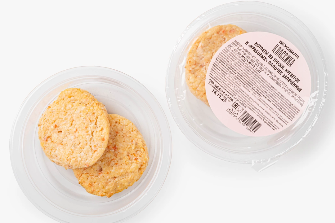 Нежные рыбные котлеты для ценителей морепродуктов. Сочное филе трески дополняет сладковатый привкус аргентинских креветок, а крабовые палочки придают фаршу знакомый аромат. Мы добавили в котлеты сливочное масло и сливки, чтобы они стали особенно мягкими и сочными. При запекании они покрываются румяной корочкой, а паприка придаёт ей золотистый оттенок. Разогрейте блюдо в микроволновой печи и подайте на стол с любимым гарниром: картофельным пюре, рассыпчатым рисом или свежими овощами. У вас получится лёгкий деликатесный ужин ресторанного уровня.