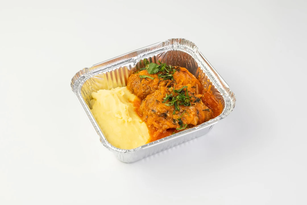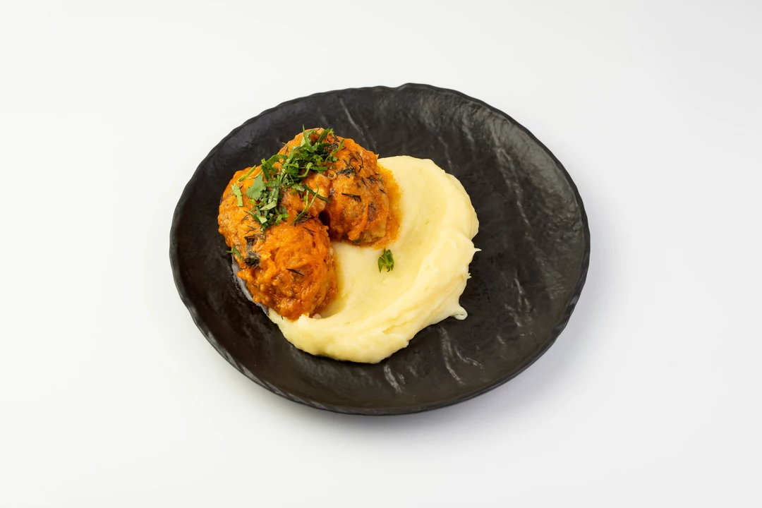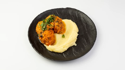 Нежные, по-домашнему уютные котлеты — это идеальный баланс сочного мясного дуэта из отборной говядины и легкого куриного филе. Добавление риса и мелко шинкованной капусты делает их невероятно мягкими и пышными, придавая текстуре особую деликатность. Каждая котлета томится в густом, ароматном томатном соусе с нотками пряных трав, который пропитывает мясо, делая его тающим во рту. Подается это блюдо с воздушным, кремовым картофельным пюре, взбитым со сливочным маслом до идеальной гладкости. Это воплощение домашнего тепла, где насыщенный вкус соуса встречается с нежностью гарнира, создавая безупречное гастрономическое сочетание.