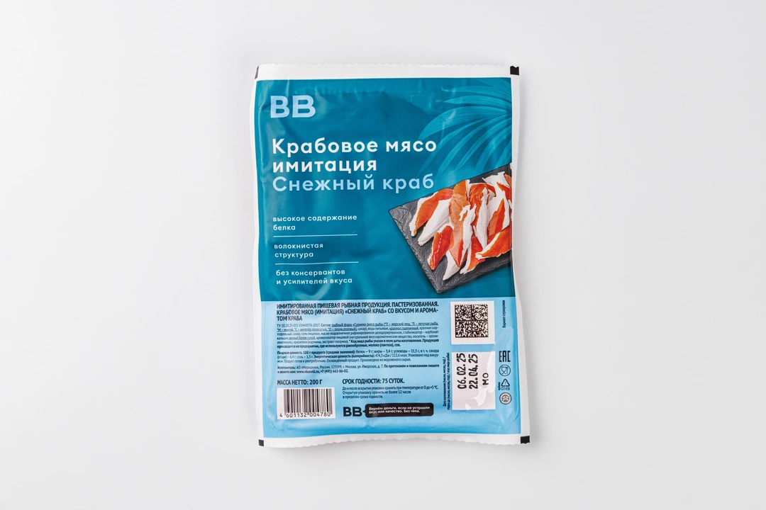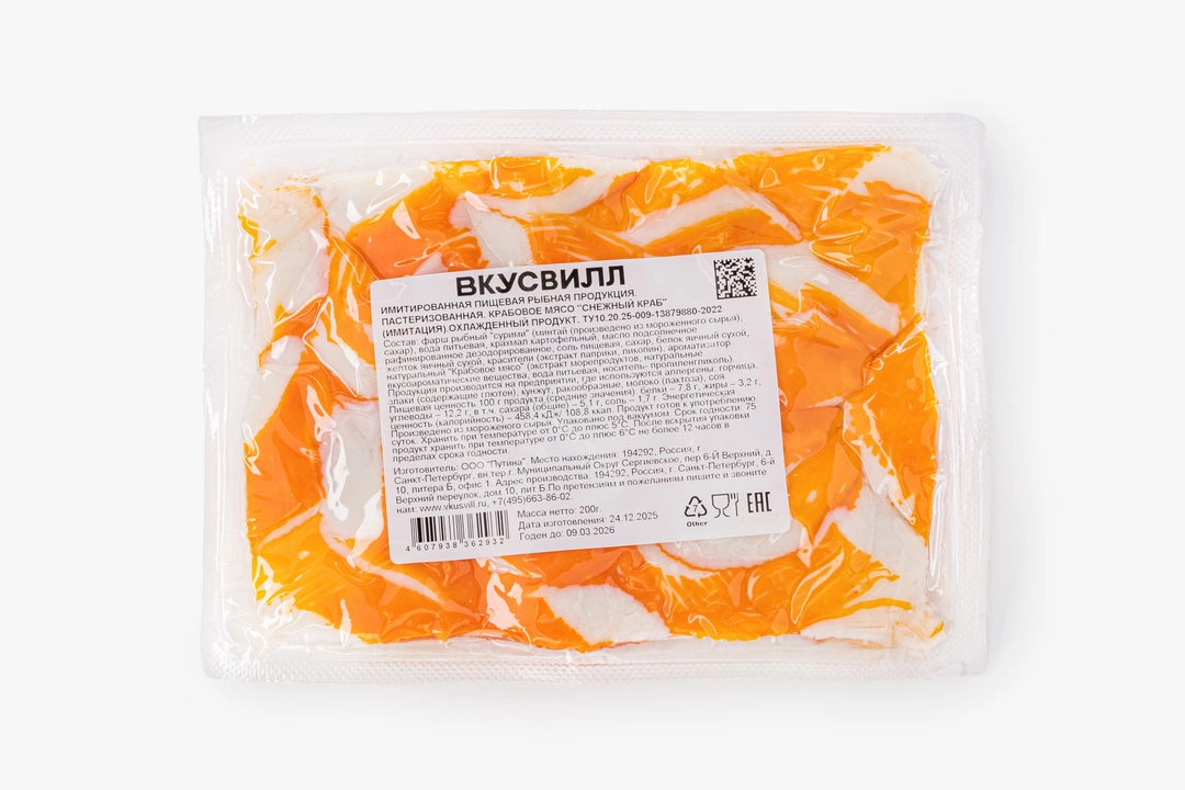 «Крабовое» мясо для ВкусВилла готовят по уникальной рецептуре: без химических отбеливателей, глутамата, консервантов и искусственных красителей. В «Снежном крабе» повышенное содержание рыбного фарша сурими, поэтому вкус и структура особенно нежные. Лёгкая закуска и ингредиент для любимых салатов.