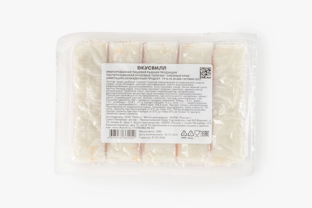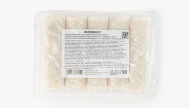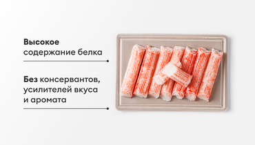 «Крабовые» палочки для ВкусВилла готовят по уникальной рецептуре: без химических отбеливателей, глутамата, консервантов и искусственных красителей. В «Снежном крабе» повышенное содержание рыбного фарша сурими, поэтому вкус и текстура особенно нежные. Идеальная закуска и ингредиент для любимых салатов.