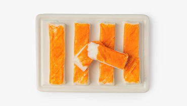 У наших «крабовых» палочек нежный вкус и аппетитная волокнистая структура. Приготовлены по запросу ВкусВилла: без искусственных красителей, консервантов и глутамата