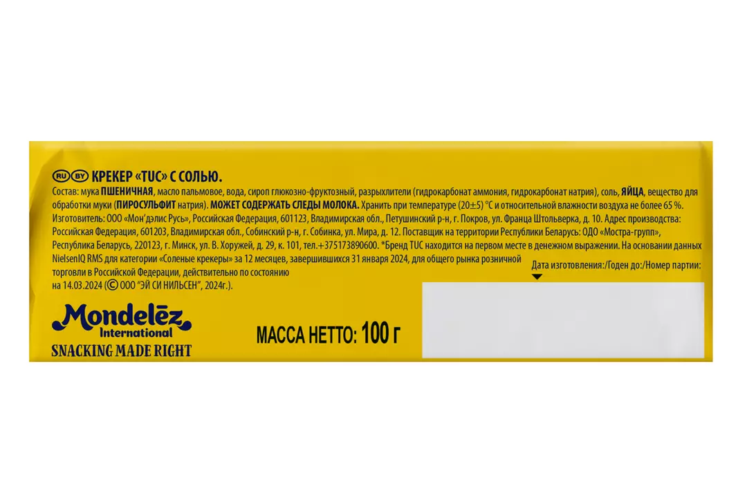 Крекер TUC с солью, 100г. Крекеры TUC Original с солью рассыпаются во рту на хрустящие нежные кусочки. Легкое печенье не содержит ароматизаторов, яркий вкус обеспечивается оригинальной рецептурой и крупной солью на поверхности каждого снека. Ими можноутолить голод в поездке или на прогулке, устроить легкий перекус, использовать как закуску или как основу для бутербродов и канапе — крекер с классическим соленым вкусом хорош в любой ситуации! Удивляйте себя и близких такими разными вкусами вместе с TUC Original! Страна производитель-Россия