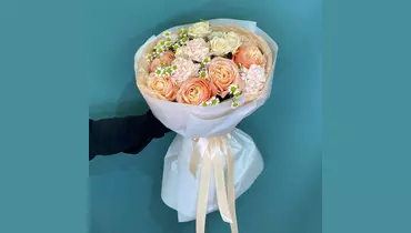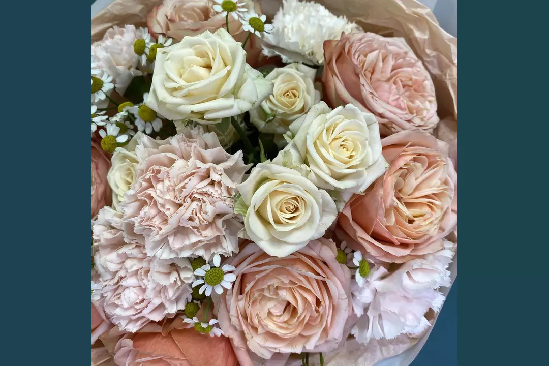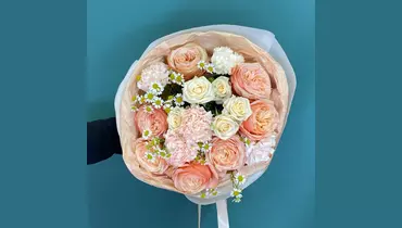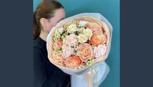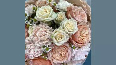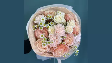 Невероятно нежный букет Состав: Роза кустовая - 1 шт. Гвоздика - 5 шт. Матрикария - 1 шт. Роза кахала - 7 шт.
