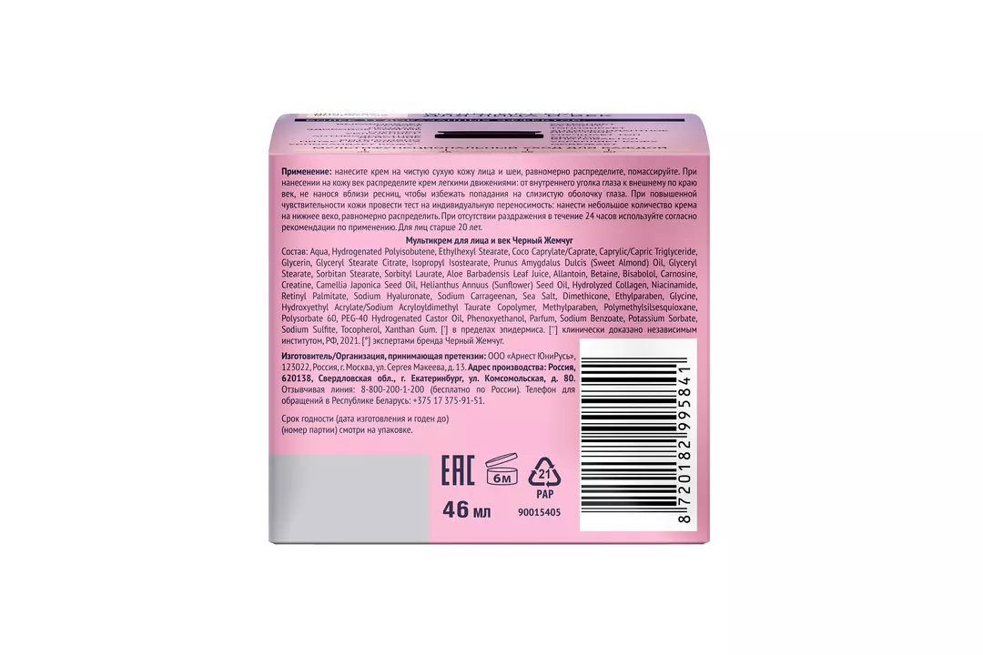 Мультикрем для лица и век Черный Жемчуг — это адаптивный уход для заботы о коже лица и области вокруг глаз. В состав мультикрема входит: гиалурон, ретинол и коллаген; масла миндаля и цубаки; глицин и бетаин. Мультикрем и имеет более 11 доказанных эффектов. Среди них: антивозрастное действие; выравнивание рельефа и тона; придание здорового сияния; увлажнение и питание. Подходит для лица и век в качестве дневного и ночного ухода. Одобрен офтальмологами и дерматологами. Страна-производитель Россия