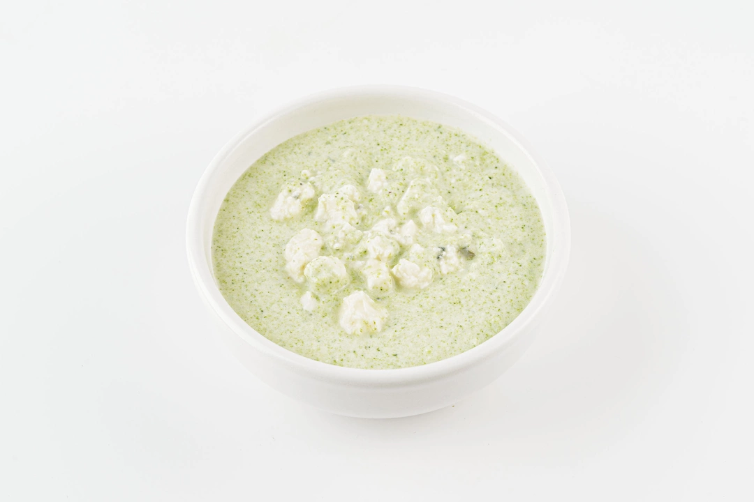 Охлаждённый густой крем-суп с бархатистой текстурой по традиционному французскому рецепту. Мы сварили его из картофеля и соцветий брокколи, добавив сливки для нежности. Положили в суп классический сыр с голубой плесенью, овощи и щепотку специй, чтобы придать ему пикантности. Слегка подогрейте блюдо перед подачей и дополните гренками из бородинского хлеба — так обед получится особенно вкусным и сытным.