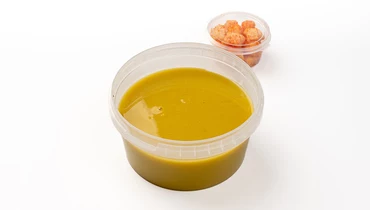 Ароматный крем-суп на кокосовом молоке из красной чечевицы, картофеля, моркови, шпината, душистого чеснока, с послевкусием копченого бекона. Подается с хрустящими гренками.