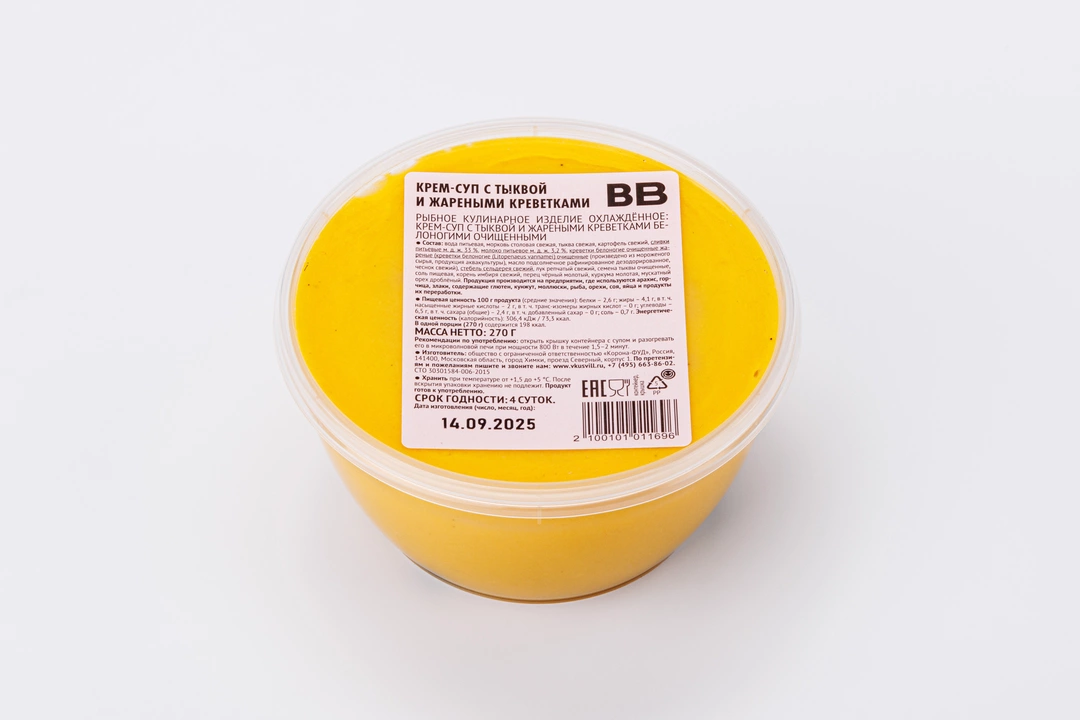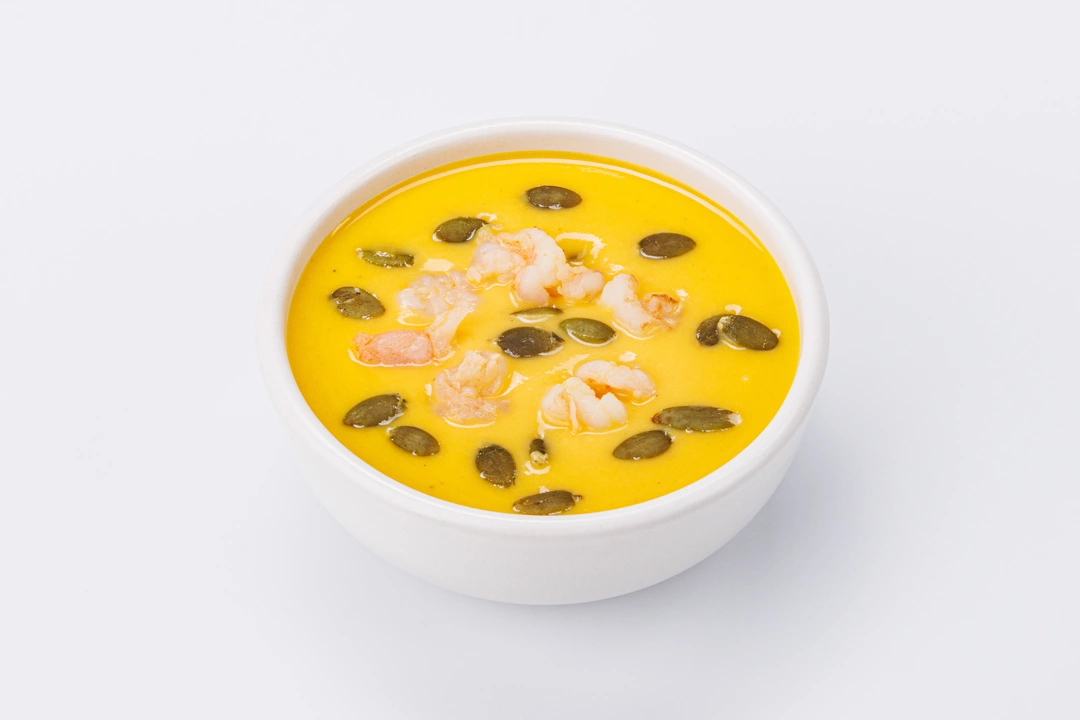 Нежный картофельно-тыквенный суп с морепродуктами. Сливки придают вкусу мягкость и лёгкость, а специи добавляют тёплые акценты с лёгкой пряной нотой. Креветки слегка обжарены и добавлены вместе с хрустящими семенами тыквы. Подогрейте суп и возьмите кусочек хлеба с плотным мякишем или свежие тосты, которые можно макать в густую кремовую основу. Блюдо можно подать на обед или на ужин, когда хочется согреться и порадовать себя чем-то необычным.