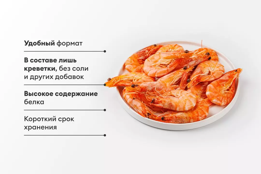Уже отваренные креветки без соли и других добавок. Богаты белком. Мы не используем консерванты, поэтому у продукта короткий срок хранения — всего 6 суток.