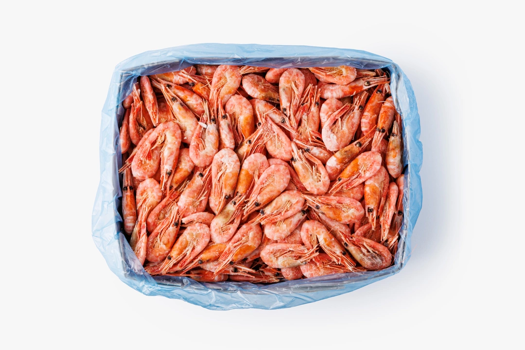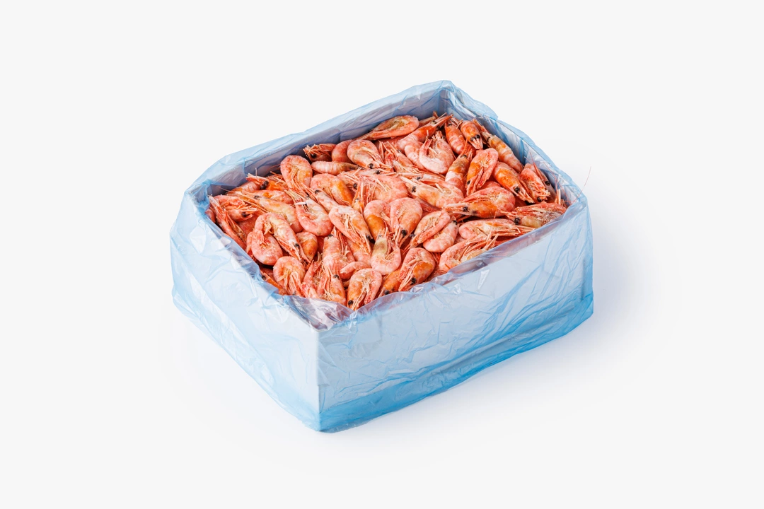 Дикие северные креветки в тонкой ледовой глазури. Калибр у этого вида некрупный: в одном килограмме около 150 штук. Креветки хороши для приготовления салатов, пикантных азиатских супов, пасты с морепродуктами и лёгких деликатесных закусок в тарталетках. Продукт уже отварен и заморожен. Для бережной разморозки достаточно залить их тёплой водой, посолить и добавить специи по вкусу.