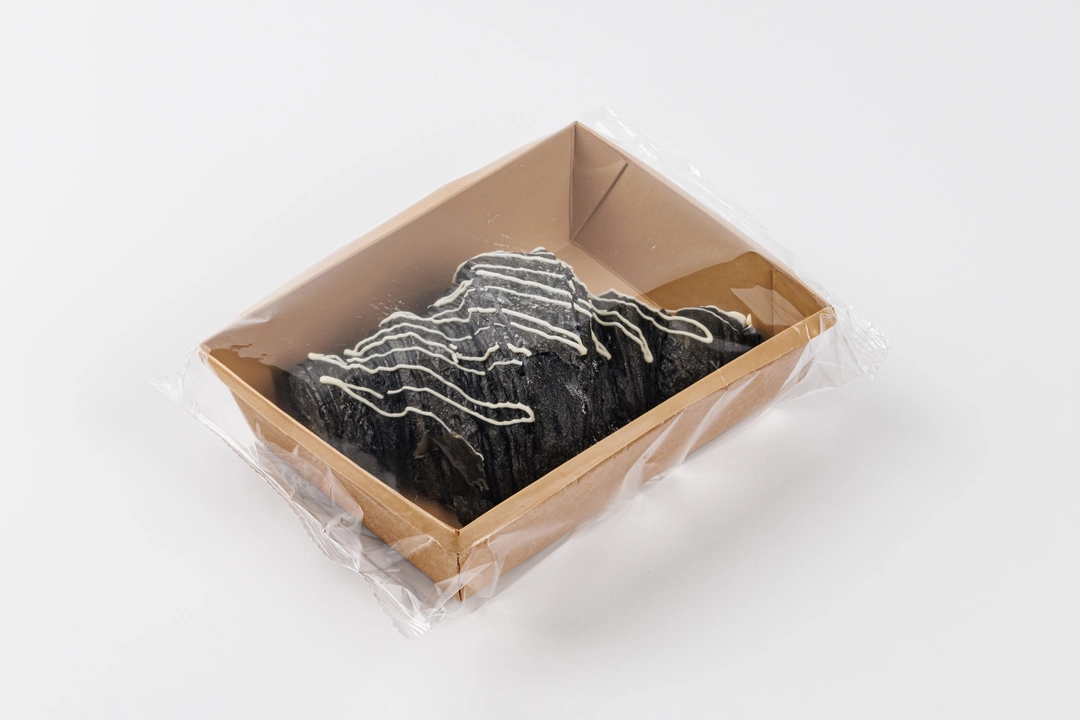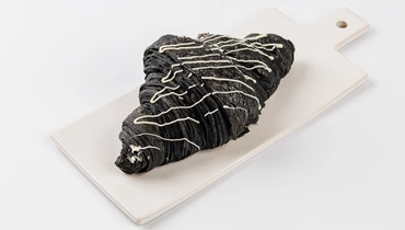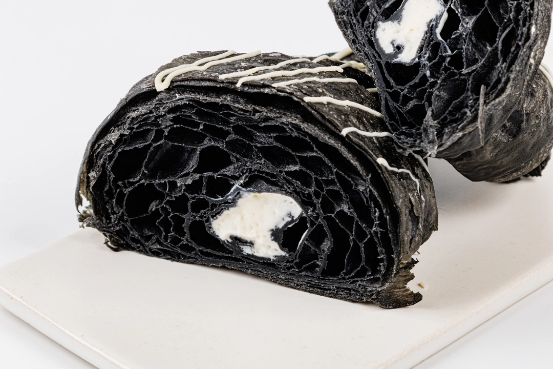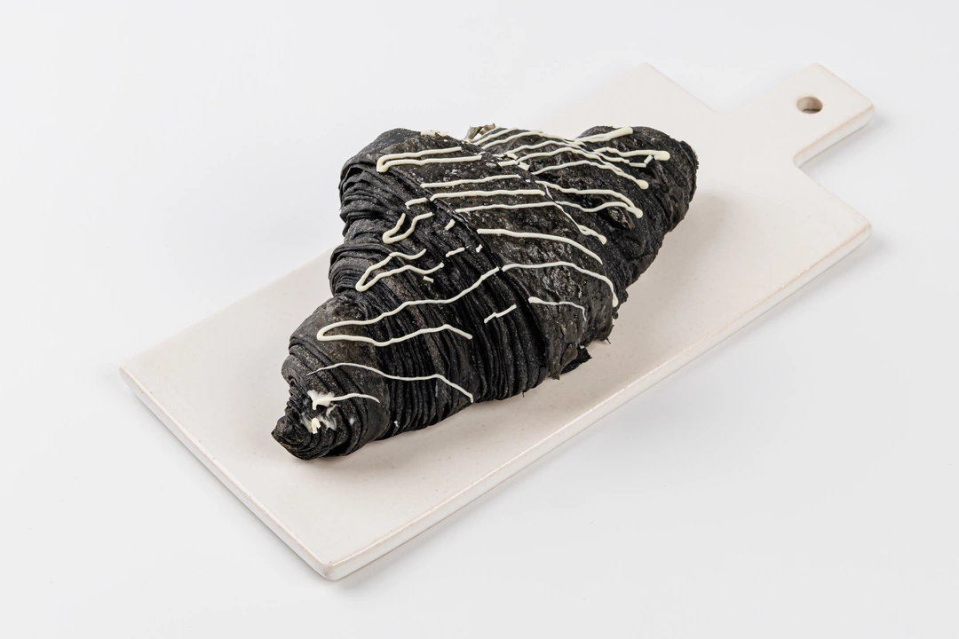 Круассан с заварным кремом — фантазия на тему классики, только в неожиданном исполнении. Тесто нежное, с тонкими золотистыми слоями, а внутри — мягкий заварной крем с белым шоколадом и лёгкой сливочной ноткой. Сладость сбалансированная, вкус — деликатный и запоминающийся. Это не просто десерт, а кулинарный эксперимент, в котором всё получилось. Глубокий чёрный цвет теста достигается за счёт растительного угля — он не влияет на вкус, но придаёт эффектности.