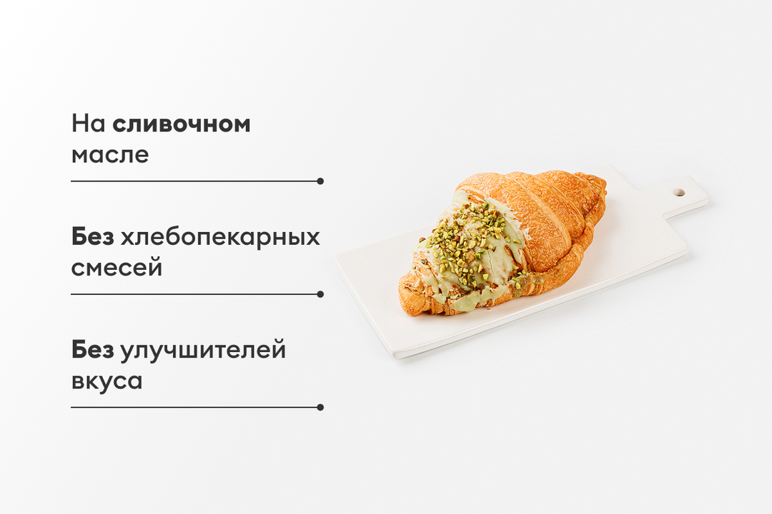 Классическое французское лакомство из слоёного теста, органично дополненное тающей во рту фисташковой пастой. В качестве декора — нежная сахарная помадка с россыпью дроблёных фисташек. Румяный, с воздушной текстурой и глубоким кремово-ореховым вкусом, такой круассан станет достойной причиной уйти на сладкий перерыв.