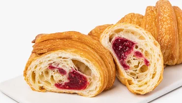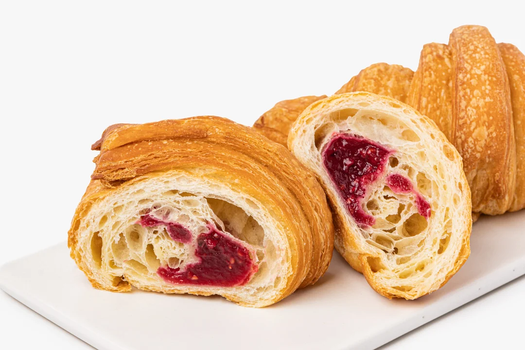 Два круассана, которые легко приготовить дома. Они получатся традиционно слоёными, с тонким ароматом выпечки и румяной корочкой, хотя этот вариант круассанов — без сливочного масла, яиц и молока. В составе только растительные ингредиенты, а вкус по‑настоящему домашний. Тесто на подсолнечном масле, внутри — малиновая начинка
