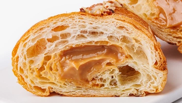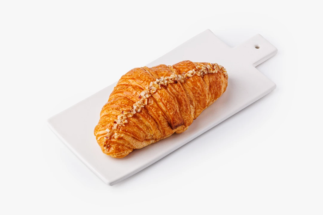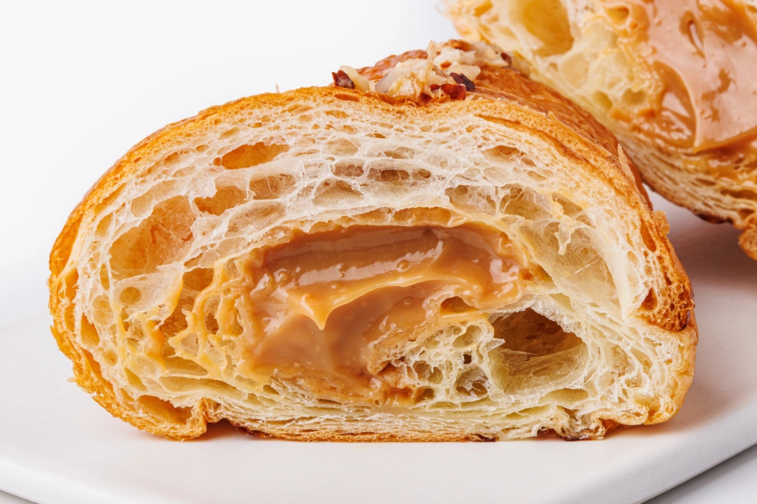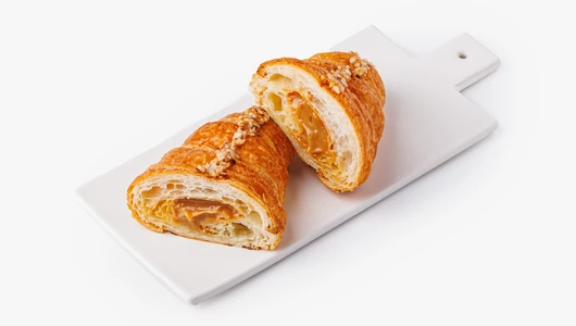 Классический французский круассан с начинкой из варёной сгущёнки. Слоёное тесто на сливочном масле получается мягким и воздушным. Сверху выпечка посыпана дроблёными ядрышками фундука. Это готовый вариант для сытного завтрака или перекуса в течение дня. Такой десерт легко превратит обычное чаепитие в праздник.