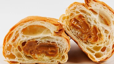 Слоёное тесто с хрустящей корочкой, сливочное на вкус, с лёгкой сладостью — а внутри тёплая, густая начинка с варёной сгущёнкой. Немного дроблёного фундука добавляет лёгкую ореховую нотку. Такой круассан хорош и как быстрый завтрак, и как небольшая пауза в течение дня — с чашкой кофе или просто так.