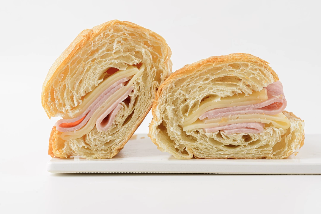 Мы приготовили круассан на сливочном масле с ветчиной и голландским сыром. Слоёное тесто получилось воздушным, с хрустящей корочкой. Ветчина с цитрусовыми экстрактами придаёт выпечке пикантность, а сыр добавляет молочный оттенок. Круассан хорош для сытного завтрака или перекуса в течение дня. Его можно слегка подогреть, чтобы начинка стала тёплой и более ароматной.