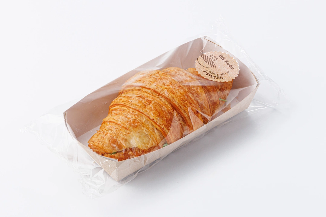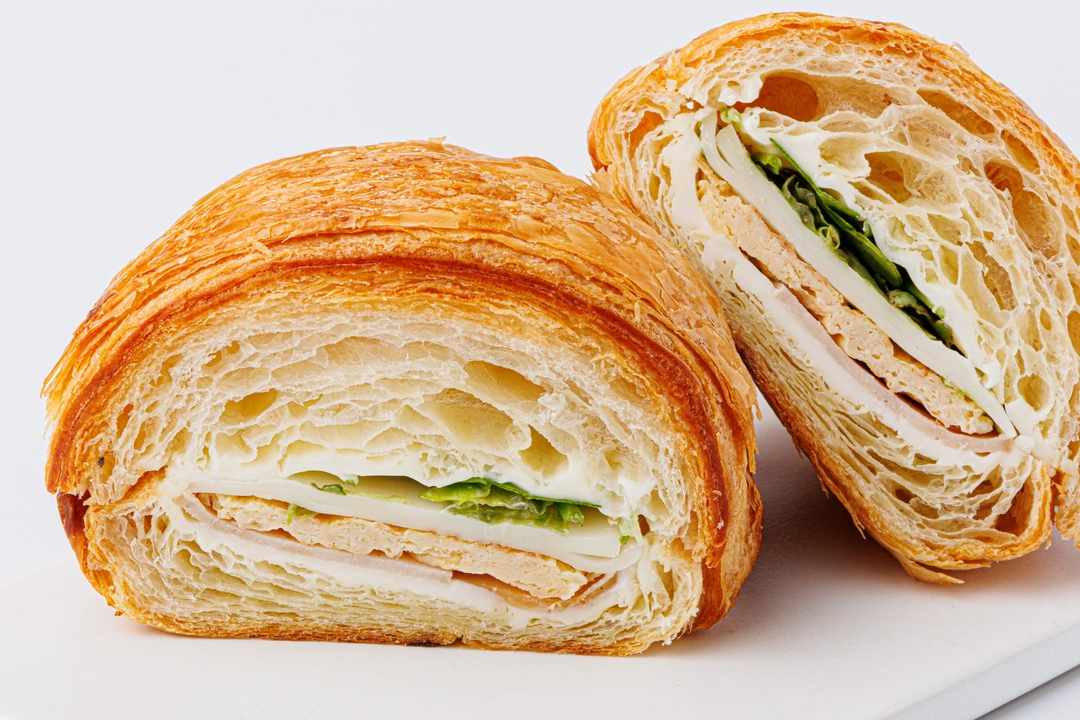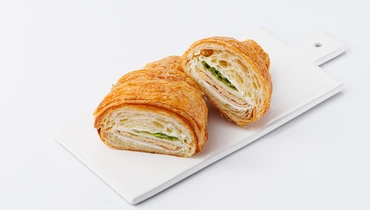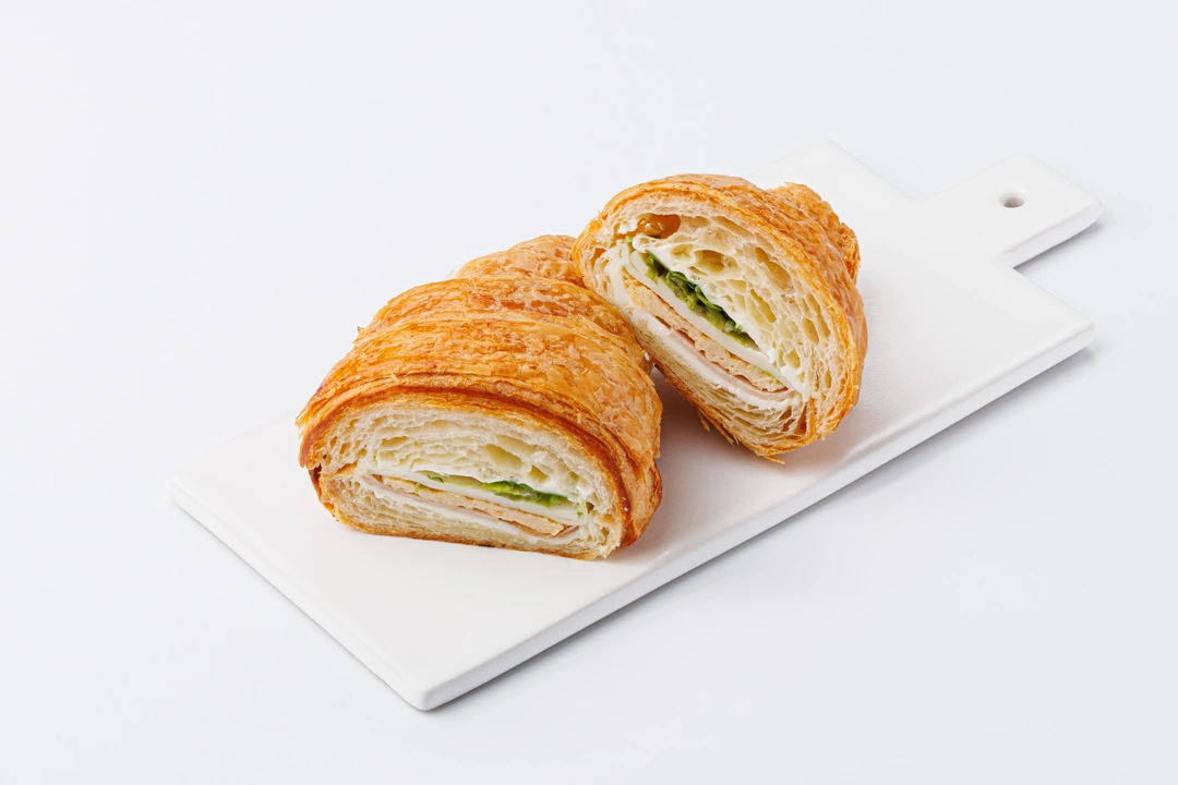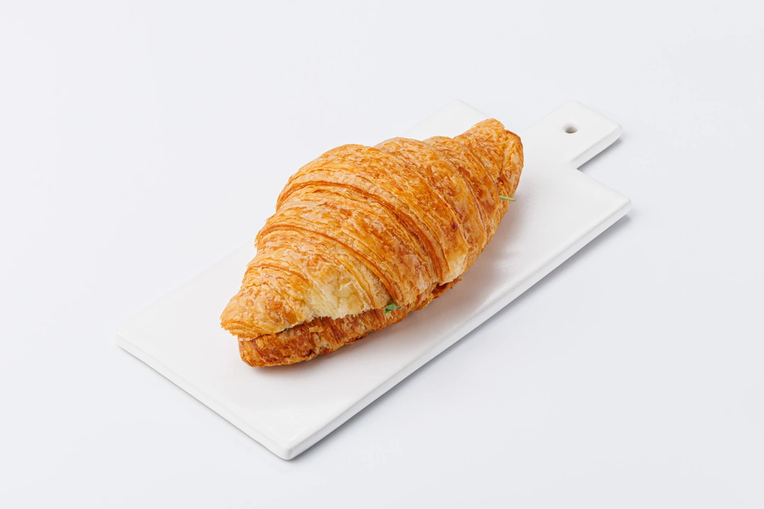 Классический круассан из слоёного теста с сытной начинкой. Внутри тонкий ломтик ветчины из индейки, лёгкий омлет и свежие листья салатного микса. Моцарелла придаёт блюду сливочный оттенок и мягкость. Аппетитный круассан хорош на завтрак или в качестве перекуса в течение дня, когда нет времени на долгую готовку.
