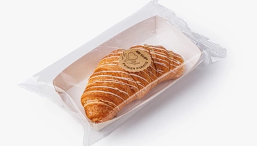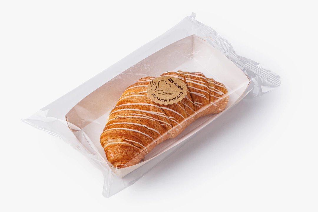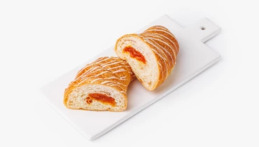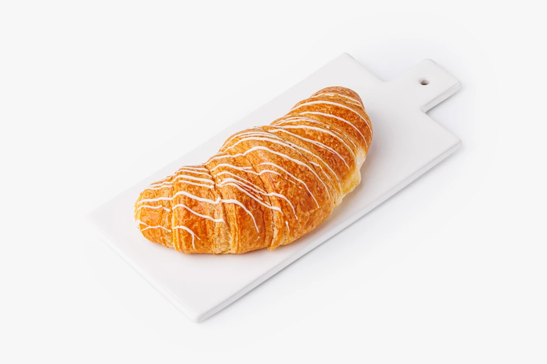 Воздушный круассан с яркой начинкой. Здесь сливочный заварной крем дополнен кисло-сладким конфитюром из облепихи. А белая глазурь с посыпкой из тростникового сахара добавляет сладости и придаёт выпечке праздничный вид. Удобный формат для сладкого перекуса — можно взять с собой или подать к чашечке кофе.