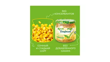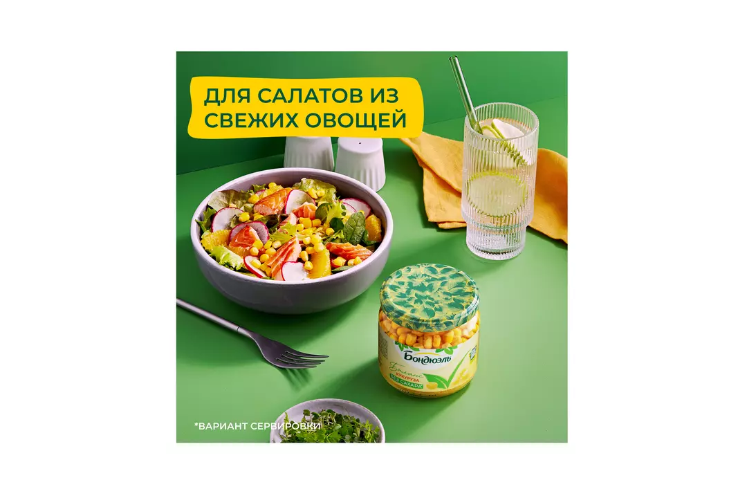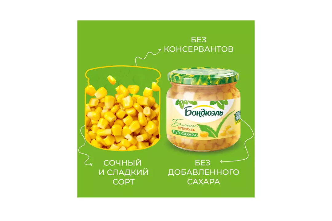 Любимая кукуруза Бондюэль теперь без сахара! Мы специально отобрали особый сорт кукурузы - она вкусная и сочная даже без добавленного сахара. Создавайте легкие и сбалансированные блюда с линейкой продуктов без сахара Бондюэль. Объем банки 350 мл масса нетто 360 г масса основного продукта 230 г Страна-производитель Россия