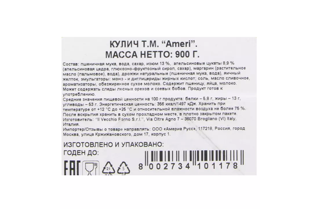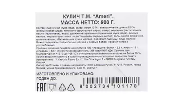 Кулич Ameri с изюмом и апельсиновыми цукатами в подарочной упаковке 900 г