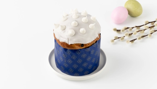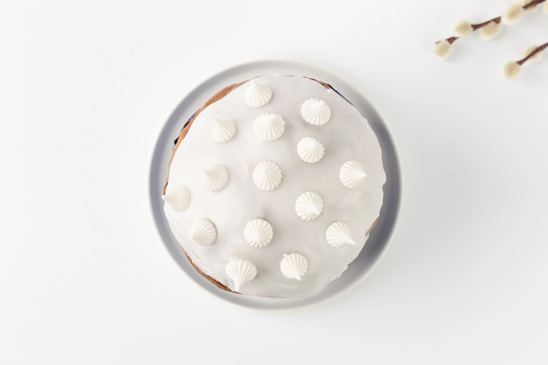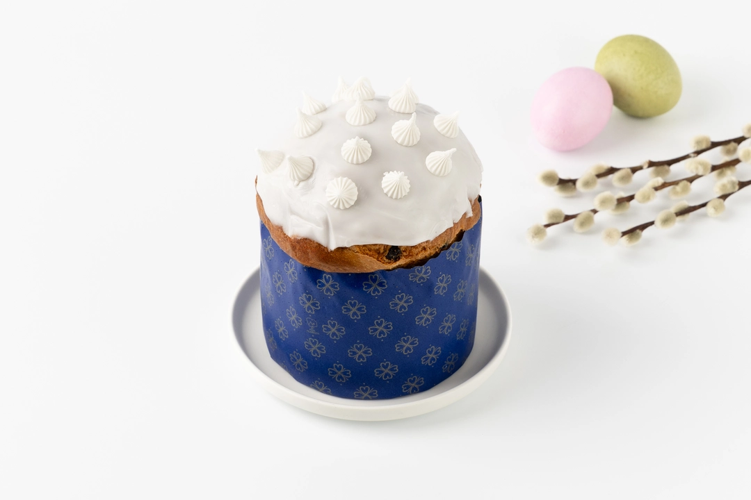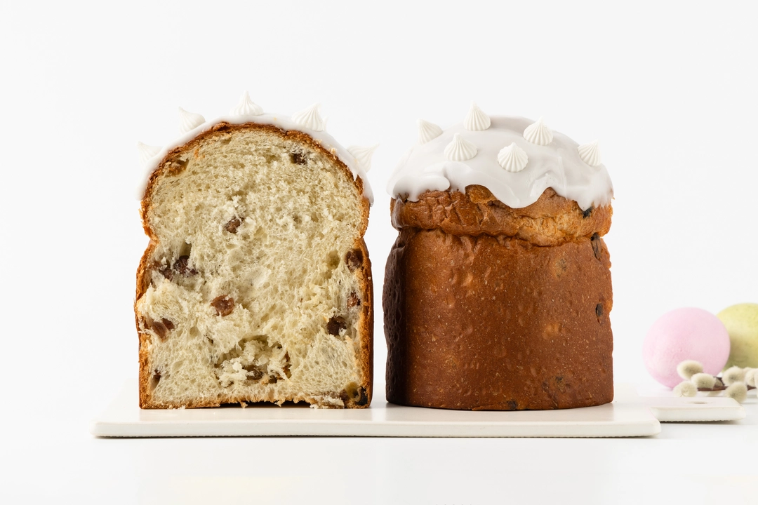Дрожжевой кулич с изюмом и сахарной помадкой — традиционная пасхальная выпечка с ярким, знакомым вкусом. Тесто получается мягким и пышным благодаря использованию топлёного масла и яичного желтка. Изюм придаёт сладость и сочность, а сверху кулич украшен белоснежной помадкой и мини-безе — они добавляют текстурный контраст и праздничный вид. Готовится на прессованных дрожжах, без ароматизаторов и консервантов.