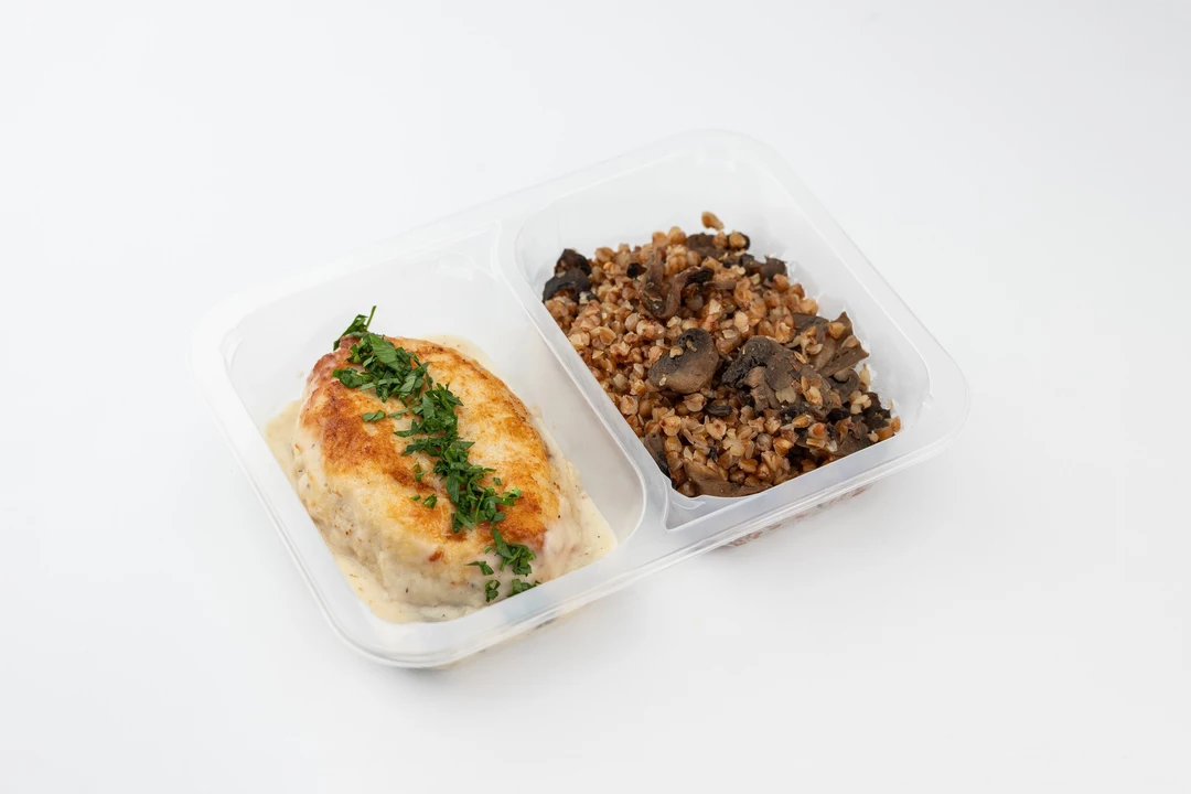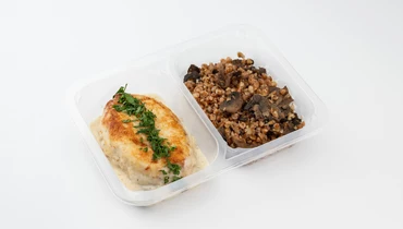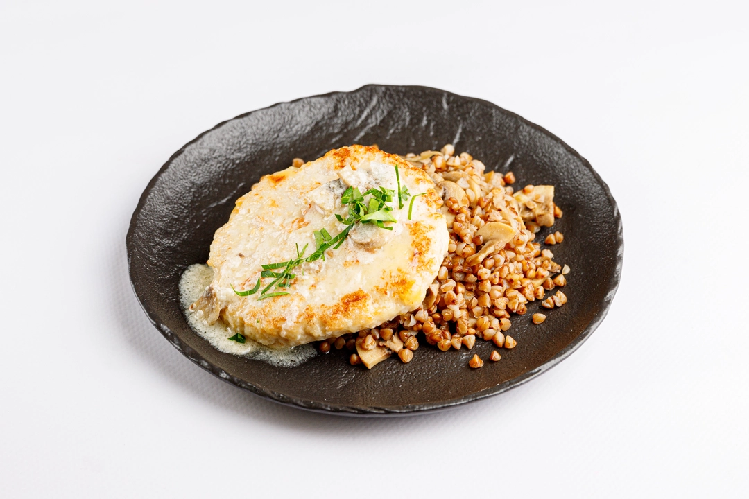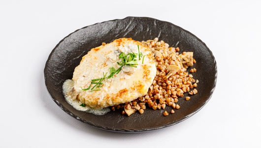 Сытное блюдо из сочных куриных котлет с начинкой из сыра Моцарелла, запеченные в собственном соку, и сдобренные сливочным соусом с ароматными шампиньонами, гарниром из гречневой каши с грибами и луком.