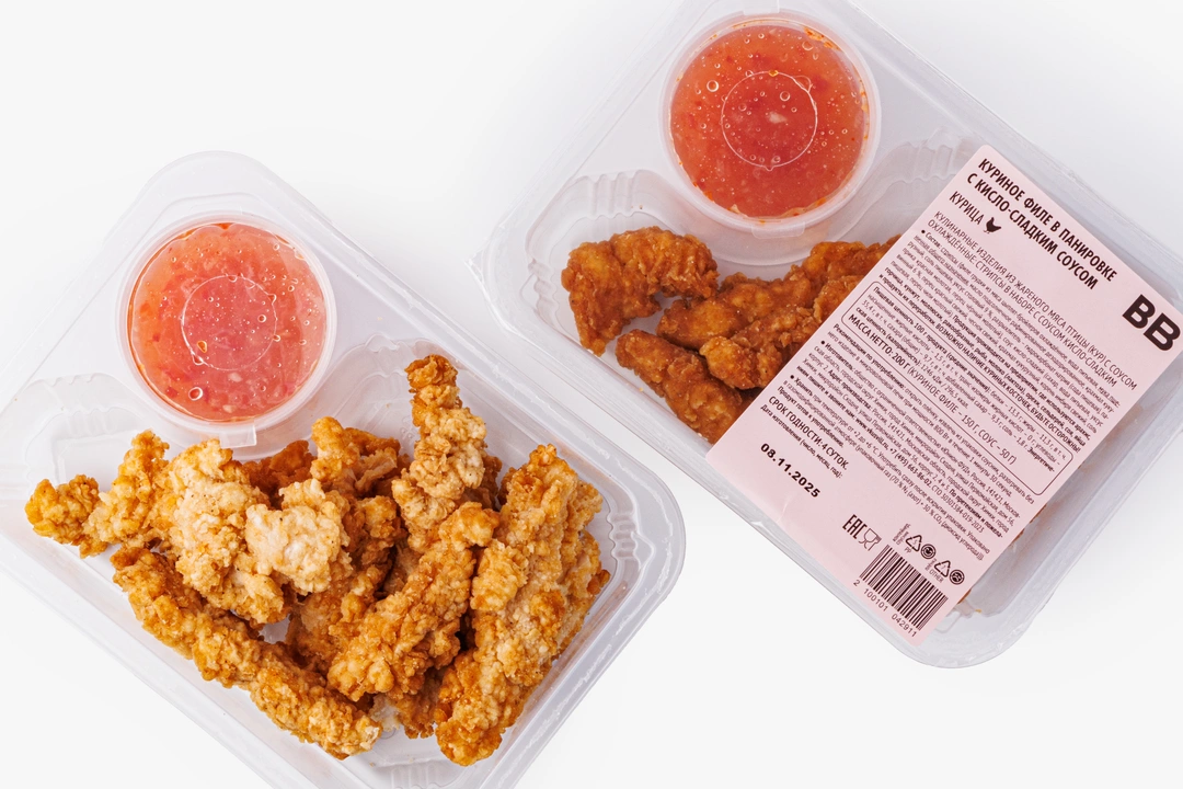 Аппетитные стрипсы из куриного филе в золотистой панировке дополняет кисло-сладкий соус с имбирём, чесноком и смесью перцев. У продукта слегка острый вкус и пряный аромат. Перед подачей на стол рекомендуем его слегка подогреть, чтобы мясо стало сочным и мягким. Переложите кусочки курицы на тарелку, полейте соусом, добавьте гарнир по вкусу — и сытный ужин готов. Это тот случай, когда простое блюдо дарит ощущение праздника без лишних усилий.