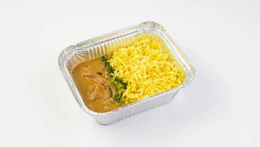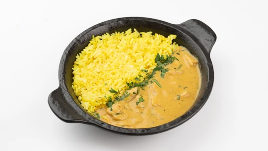 Нежнейшее куриное филе, томленое в густом, кремовом желтом карри, в гармоничном дуэте с ярко-желтым от куркумы риса (рис басмати, приготовленный с добавлением ароматных специй). Соус, приготовленный на основе кокосового молока и тщательно подобранной смеси пряностей (включая имбирь, кориандр, чеснок, куркуму и нотку чили), обладает богатым, многогранным вкусом: он одновременно пряный, слегка острый и обволакивающе сливочный. Каждый кусочек курицы буквально тает во рту, пропитанный этим ароматным соусом. Это блюдо — идеальный баланс текстур и вкусов: рассыпчатый, чуть сладковатый рис прекрасно впитывает соус, а нежное мясо составляет ему идеальную пару.