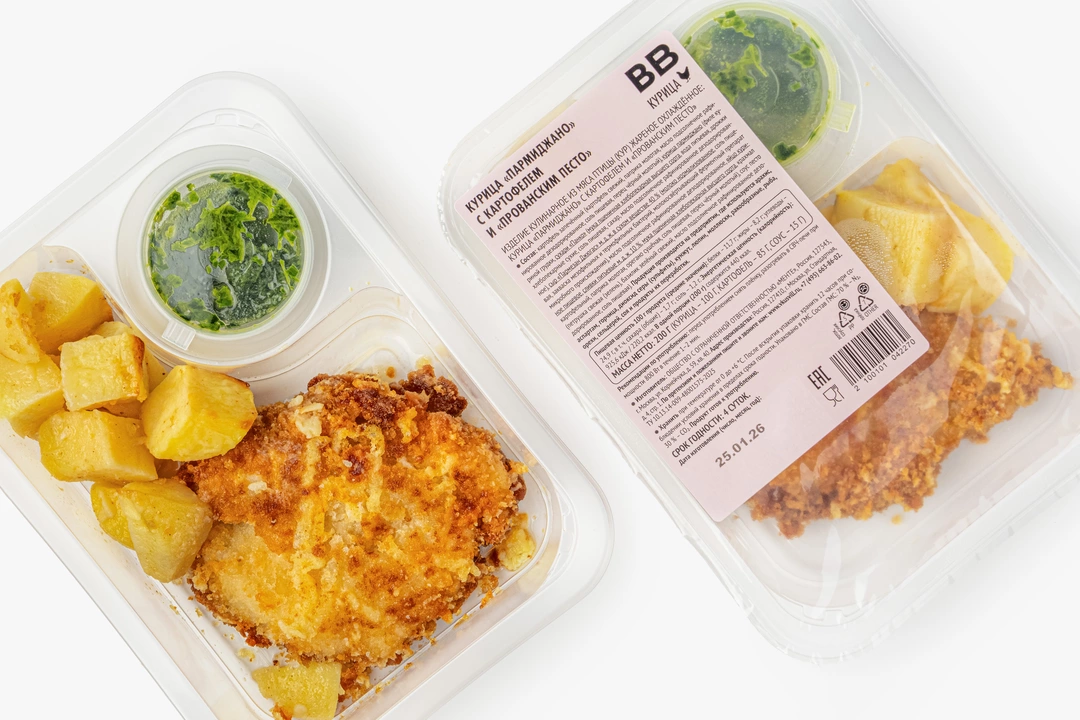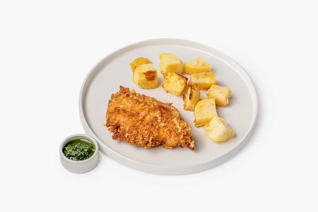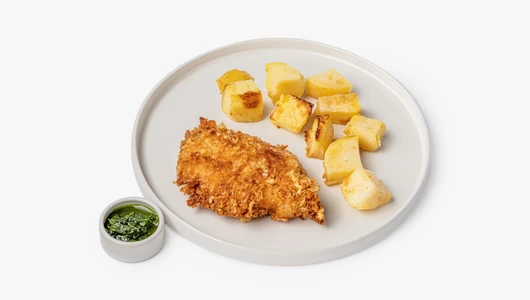 Сочная курица в хрустящей панировке с пармезаном и запечённым картофелем — это сытный домашний ужин в средиземноморском стиле. Мы обваляли филе в сухарях панко с сыром, чтобы получилась золотистая и ароматная корочка. Добавили в качестве гарнира картофель с паприкой и чёрным перцем и приготовили прованский песто на подсолнечном масле из петрушки и базилика. Просто разогрейте продукт в микроволновой печи, чтобы ваша кухня наполнилась аппетитными ароматами мяса и трав. Почувствуйте себя гостем небольшого семейного ресторана на побережье, где такое блюдо обязательно подадут с веточкой розмарина и пышной чиабаттой.