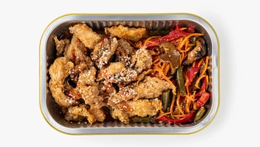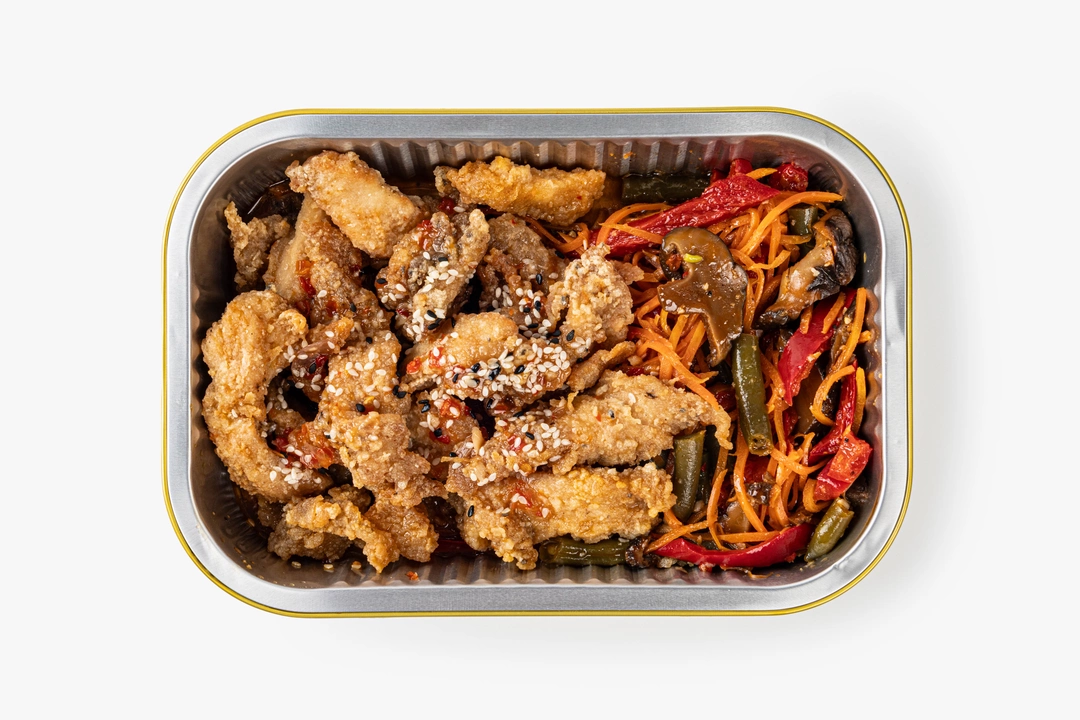 Сочные кусочки курицы в сладком соусе чили сочетаются с яркими овощами — стручковой фасолью, перцем, морковью, а также грибами шиитаке. Мы уже замариновали мясо в соевом соусе с лимоном, имбирём и чесноком, а овощи запекли с лёгким чесночным ароматом. Всё, что останется сделать, — довести блюдо до готовности в духовке или микроволновке в течение примерно 10 минут. За это время соус пропитает курицу, овощи станут мягче, а кунжут добавит лёгкую ореховую нотку. Порции хватит на двоих — насыщенный ужин по мотивам азиатской ресторанной подачи с её насыщенными вкусами и пряными соблазнами готовится проще, чем кажется.