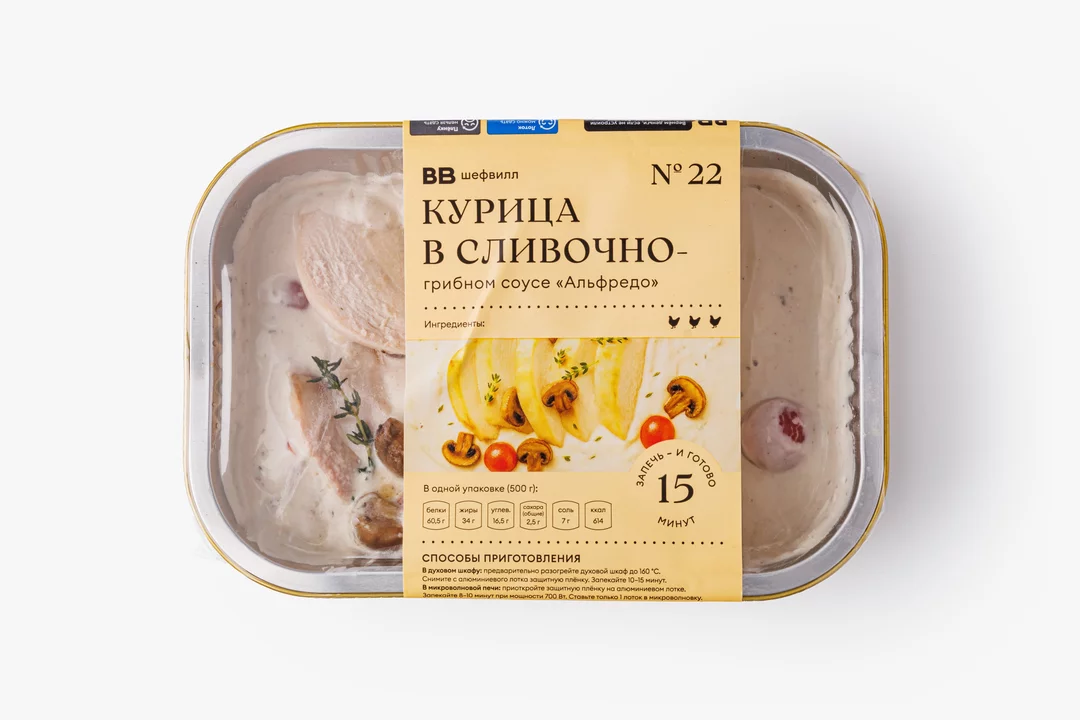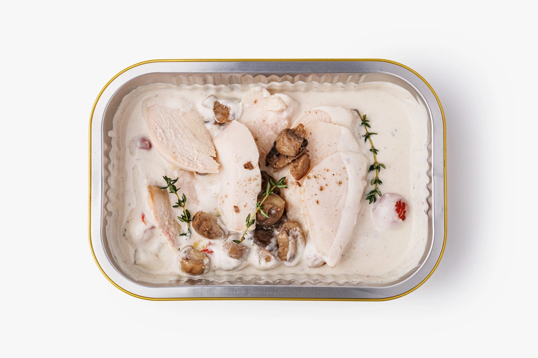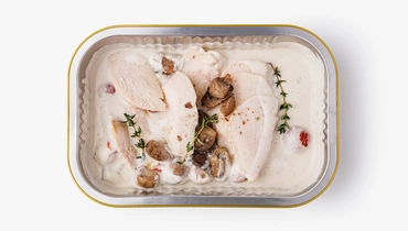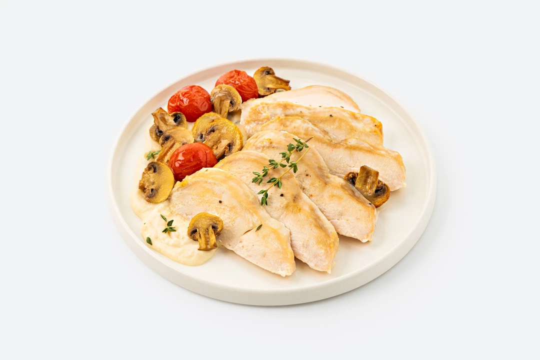 Курица в сливочно-грибном соусе — это блюдо, которое перенесёт вас на Итальянскую Ривьеру. Нежная грудка, томлённая под вакуумом, полита густым соусом на курином бульоне и сливках. Запечённые шампиньоны и томаты черри добавляют мясу яркие акценты, а белые грибы придают аромату глубину. Блюдо почти готово, его только нужно запечь в духовке до появления румяной корочки в течение 10–15 минут. В качестве гарнира можно добавить пасту или овощи, чтобы создать впечатление ресторанной подачи.