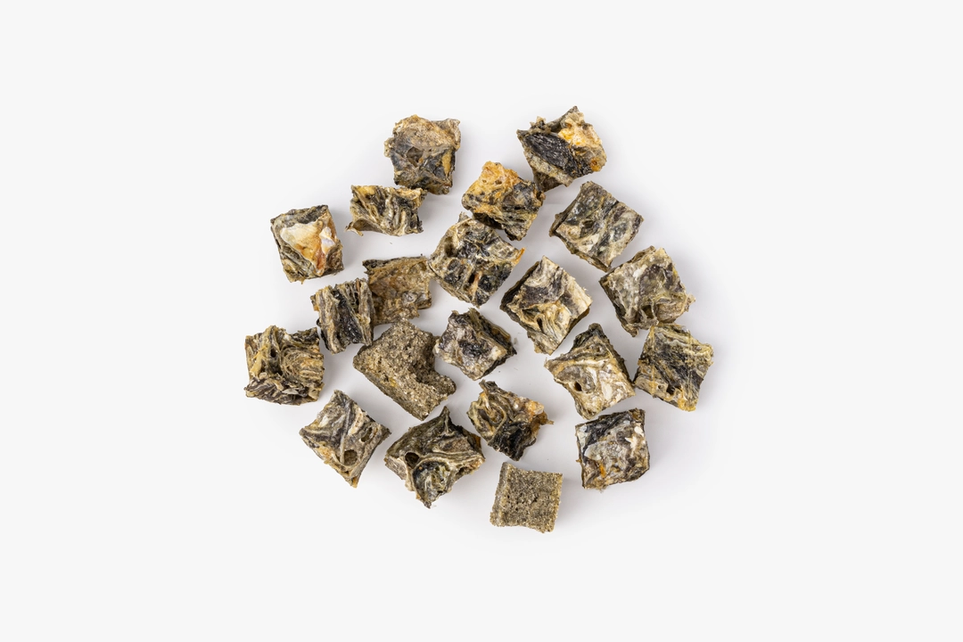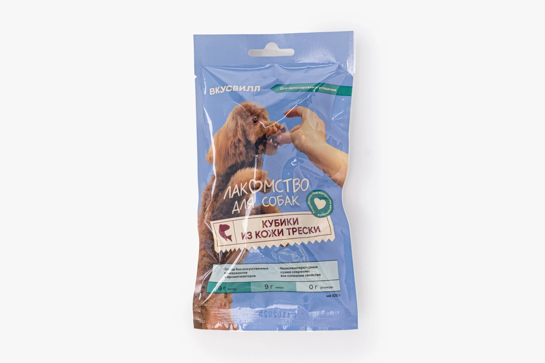 Хрустящие кубики из кожи трески — это натуральное лакомство с выразительным морским ароматом. Низкотемпературная сушка позволила сохранить природные белки и минералы без потери полезных свойств. В 100 г содержится 79 г белка. Лакомство обладает умеренной солёностью, характерной для морепродуктов. Рецепт разработан при участии ветеринаров и не содержит искусственных консервантов и ароматизаторов. Упругие кусочки помогают мягко очистить зубы от налёта во время жевания. Рекомендуемая суточная норма потребления не должна превышать 20% от основного рациона собаки.