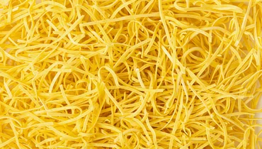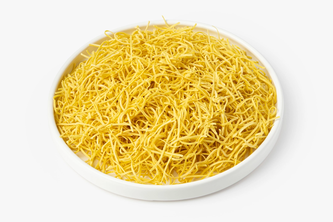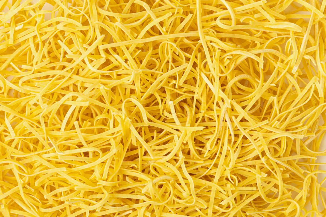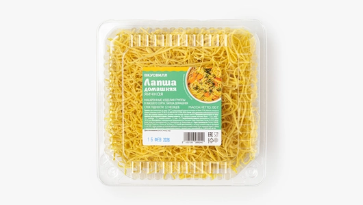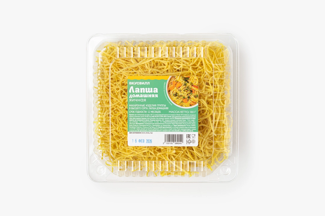 Лапша приготовлена по домашнему рецепту из пшеничной муки, куриных яиц и щепотки куркумы, придающей тесту мягкий золотистый оттенок. Во время варки продукт сохраняет упругую текстуру и эластичность, поэтому хорош для классических сытных гарниров, добавления в супы или как самостоятельное блюдо с маслом и зеленью. Лапша варится за несколько минут, она удобна для быстрого приготовления обеда или ужина для всей семьи.