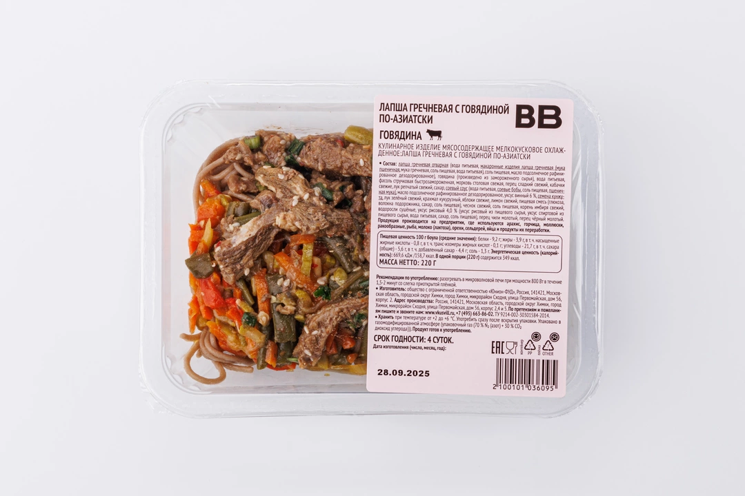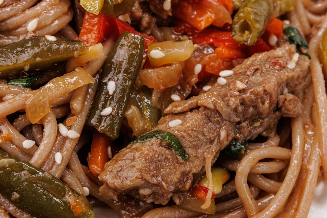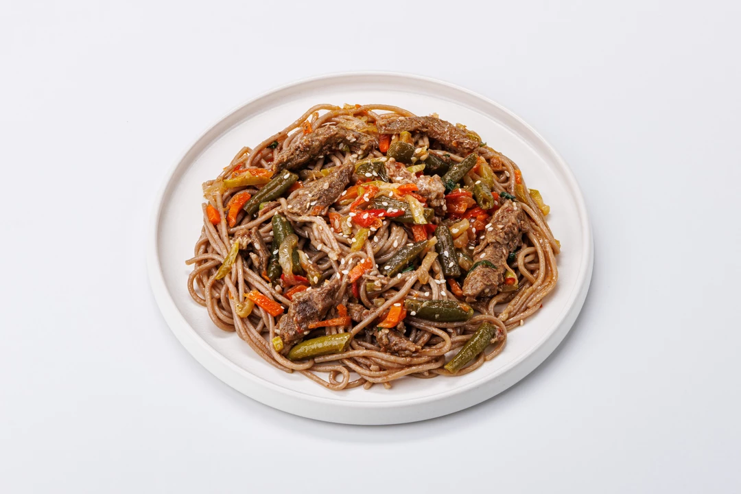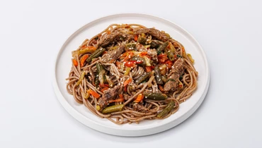 Тонкая гречневая лапша с кусочками нежной говядины, овощами и кунжутом — традиционное азиатское блюдо. Едва заметные фруктовые акценты яблока и лимона делают вкус ярче, а соус добавляет ему сочности. Перед подачей разогрейте лапшу в микроволновой печи, чтобы аромат специй стал насыщеннее и все ингредиенты пропитались аппетитной заправкой. Это готовый вариант обеда или ужина для гурманов, ценящих оригинальные, лёгкие и в то же время сытные сочетания привычных продуктов. Блюдо даст возможность совершить увлекательное гастрономическое путешествие в мир азиатской кухни.