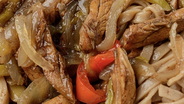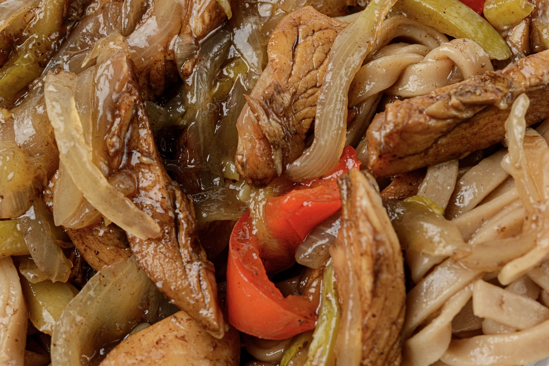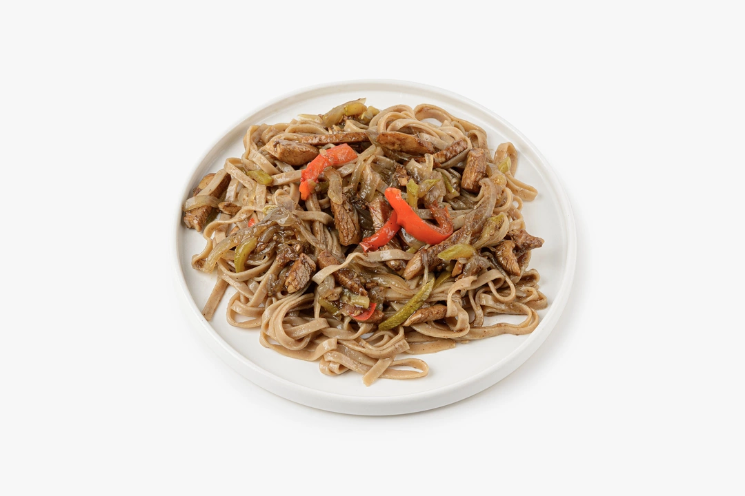 Лапша гречневая с куриным филе и овощами в соусе терияки