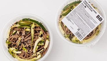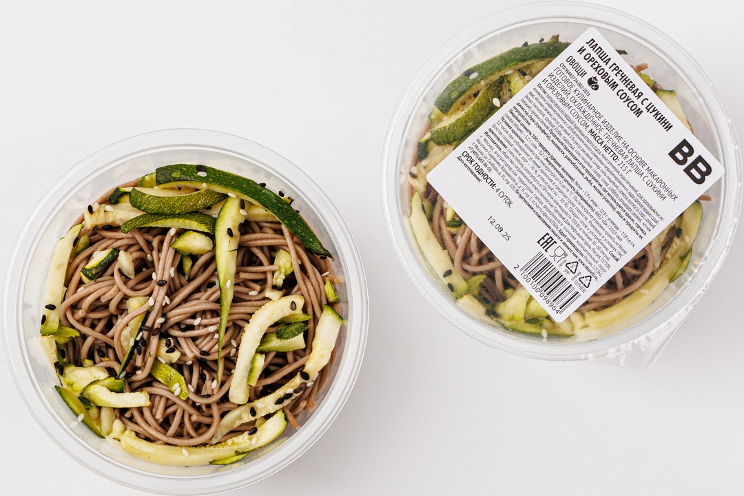 Тонкая гречневая лапша с томлёным цукини под соусом, который приготовили по уникальному рецепту: на основе оливкового масла с добавлением свежих яблок, семян кунжута и орехов кешью. Подходит в пост и для вегетарианского рациона
