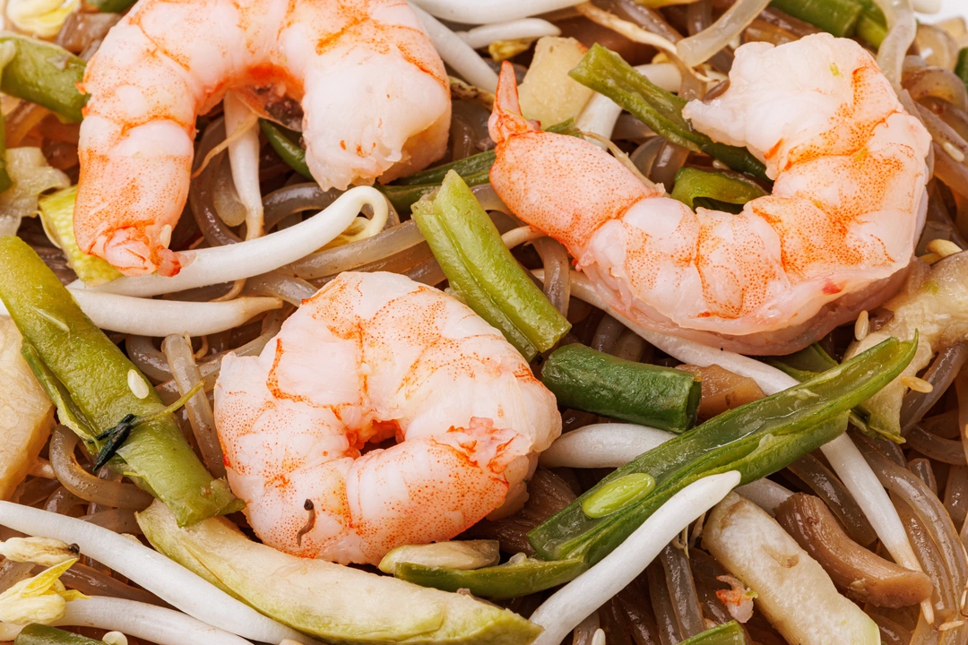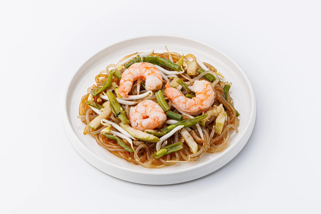 Лапша из батата с креветками в соусе терияки