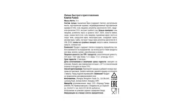 Лапша быстрого приготовления плотно вошла в нашу жизнь – это быстрый и сытный перекус дома, на даче, в поездке или на работе. Самым популярным вкусом в Корее уже много лет является Кимчи Рамен – вегетарианская лапша с квашеными овощами. Национальное блюдо кимчи – это острые хрустящие овощи, ферментированные особым способом. Легкая и в то же время сытная овощная лапша в пряном бульоне – находка для людей, следящих за фигурой, и истинное удовольствие для гурманов, любящих пикантный и острый Рамен. Страна производитель-Китай