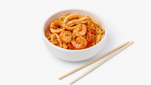 Рисовая лапша с морепродуктами и овощами в фирменной заправке понравится любителям оригинальных азиатских вкусов. Мы приготовили классический тайский соус на основе рыбного соуса, мякоти тамаринда и маринованного чили для баланса сладости, кислинки и остроты. К нему добавили креветки и кальмары, а также хрустящий сладкий перец, кабачок и морковь и посыпали семенами кунжута. Блюдо нужно разогреть, чтобы лапша и морепродукты пропитались соусом и приобрели неповторимый аромат. Это быстрое решение для тех, кто хочет попробовать аутентичную тайскую кухню у себя дома.
