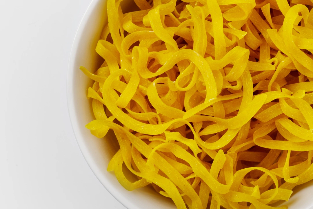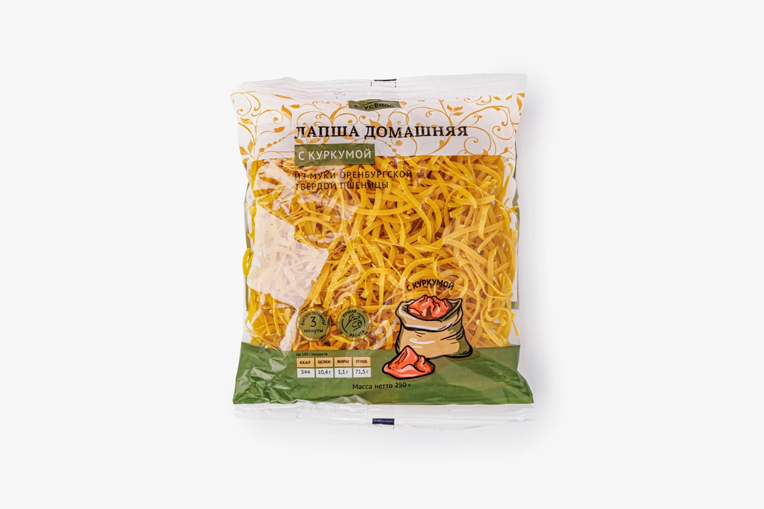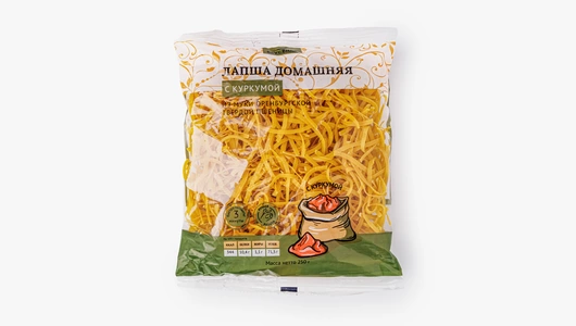 Лапша из твёрдых сортов пшеницы, изготовленная вручную без добавления яиц. Благодаря куркуме в составе она обладает не только нарядным золотистым цветом, но и насыщенным вкусом с оттенками пряностей. Такую лапшу можно добавить в суп или подать на гарнир, а смелые экспериментаторы могут использовать её для приготовления лёгкой пасты.Способ приготовления: варить 8 минут, помешивая (на 100 г лапши 1 л воды, 5 г соли).