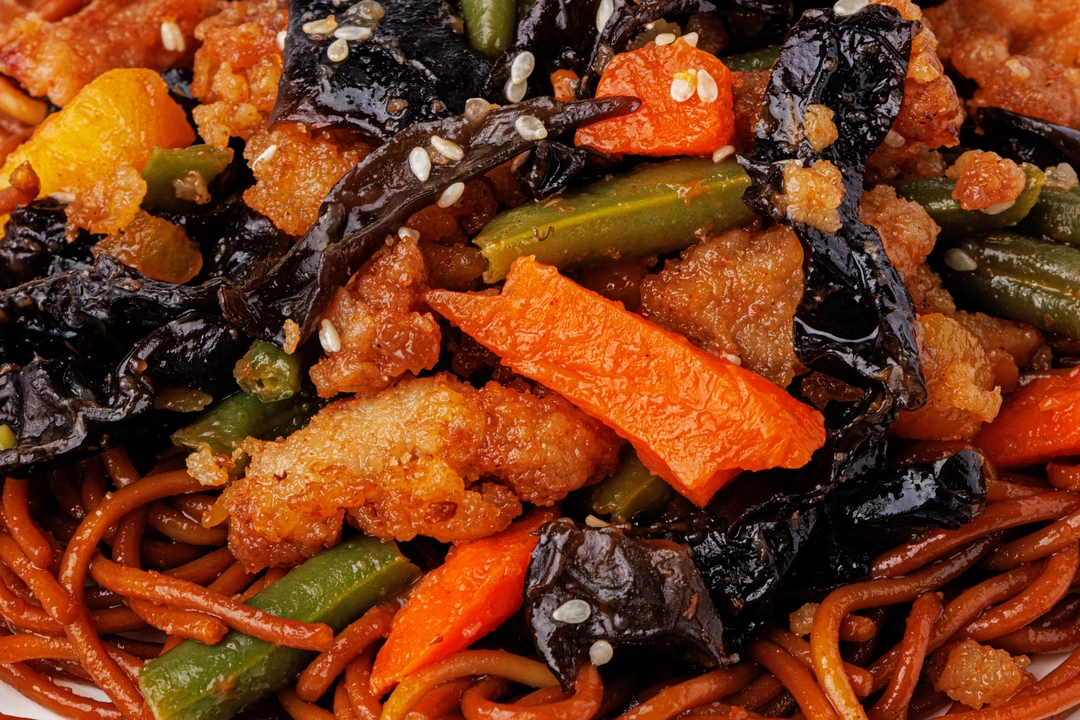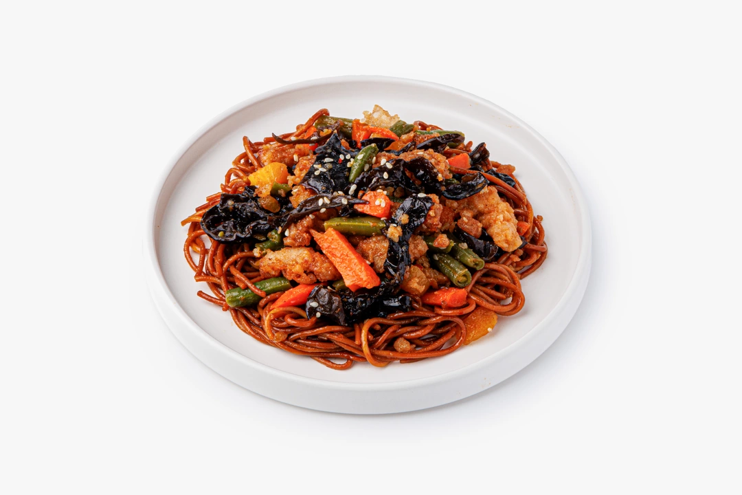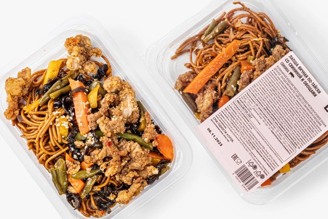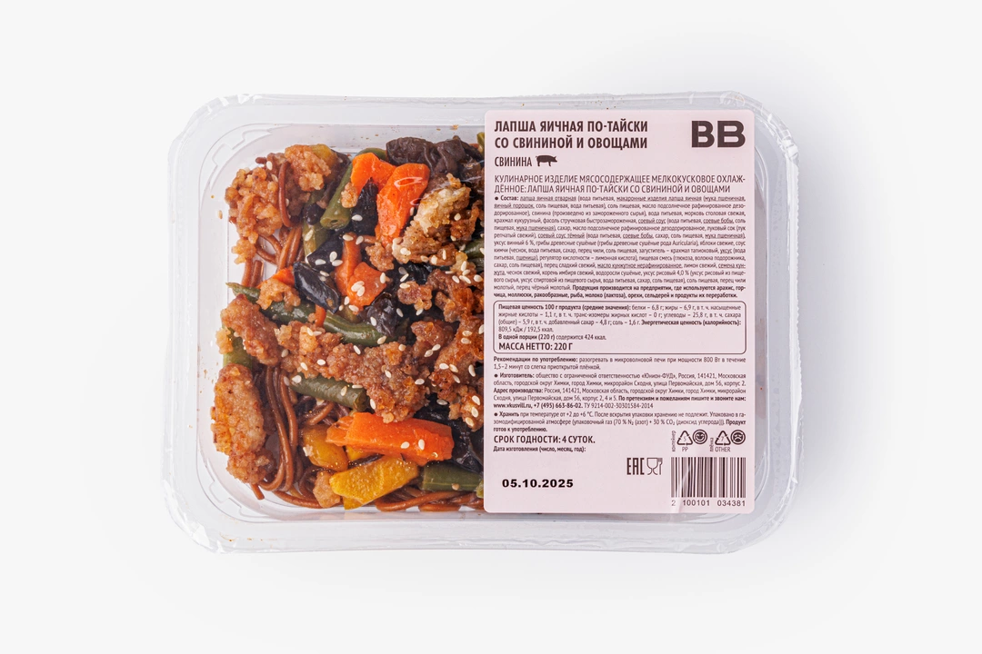 Тонкая яичная лапша приготовлена по традиционному тайскому рецепту и приправлена соевым соусом и соусом кимчи, а мягкие и сочные кусочки свинины дополнены свежими овощами, сушёными водорослями и пряностями. Мы добавили в блюдо любимые в странах Юго-Восточной Азии древесные грибы, которые придают ему характерное послевкусие, и посыпали сверху семенами кунжута. Это классическое блюдо азиатской кухни оценят любители остро-пряных вкусов. Разогрейте его в микроволновой печи и насладитесь ярким ужином в стиле банкогских кафе и ресторанов, где можно попробовать самые смелые сочетания продуктов.