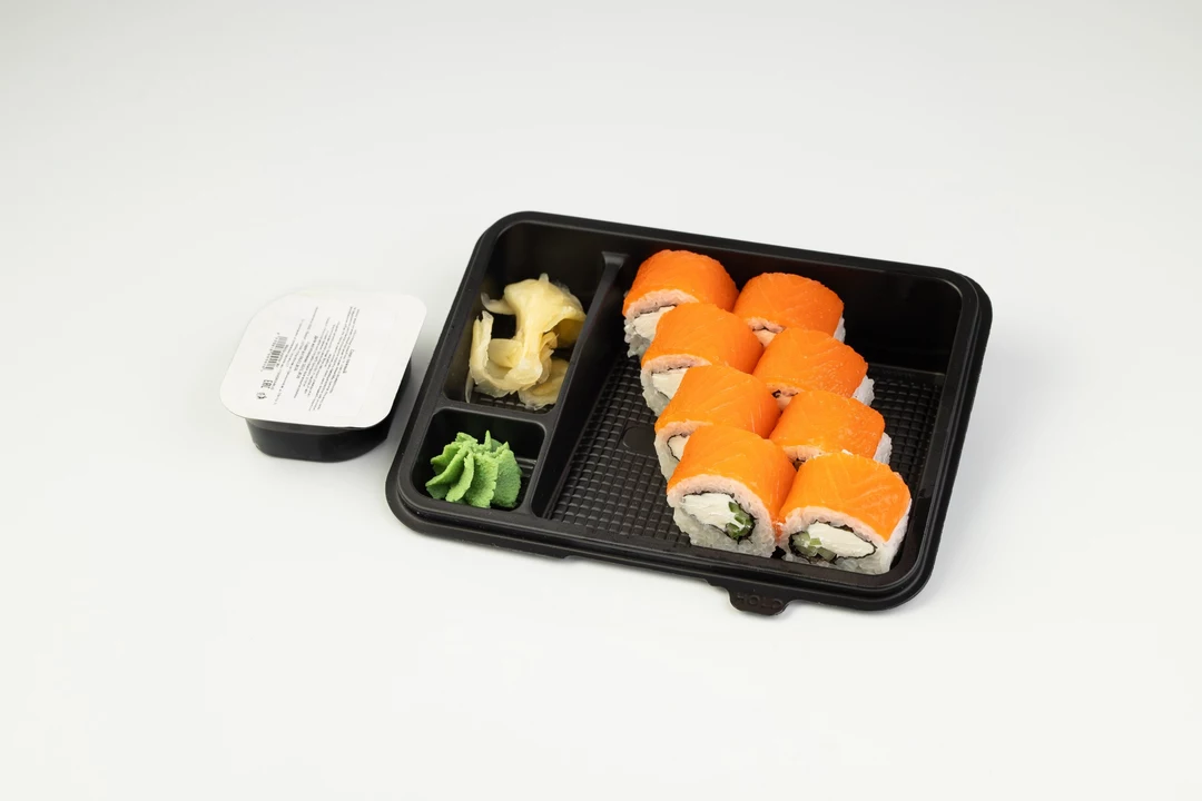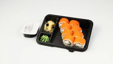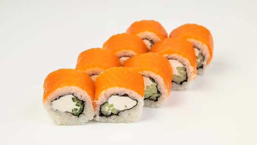 Традиционный ролл со свежим огурцом и сливочным сыром под слайсами слабосолёного лосося. Подается с соевым соусом, маринованным имбирем, васаби.