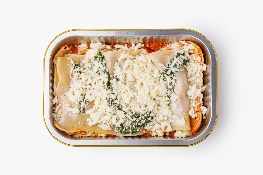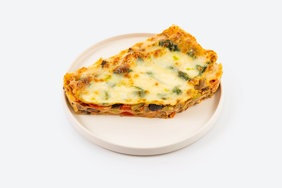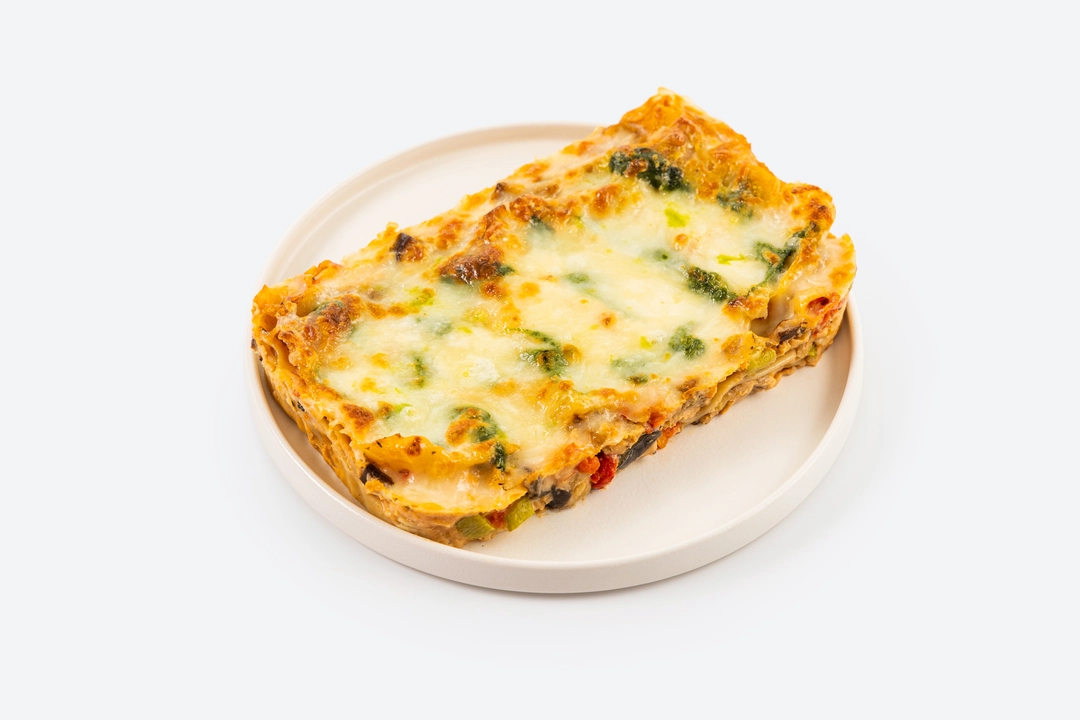 Лазанья, в которой среди слоёв пасты из твёрдых сортов пшеницы скрывается настоящий сад из запечённых баклажанов, кабачков и сладкого перца. Два соуса создают гармоничный дуэт: бешамель с мускатным орехом и томатный соус с итальянскими травами. А ярким акцентом выступает песто на основе шпината, базилика и арахиса, который придаёт блюду свежую травяную нотку. Мы уже собрали блюдо и добавили сверху моцареллу с пармезаном. Останется лишь довести до готовности примерно за 10 минут в духовке или микроволновке — соусы пропитают пасту, сыр расплавится, и появится аппетитная золотистая корочка. Лазанья рассчитана на двоих, и по вкусу она не уступает ресторанной версии: ароматная, сочная и с мягкой текстурой, где в каждом кусочке чувствуется летнее изобилие овощей и дух Италии.