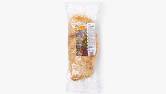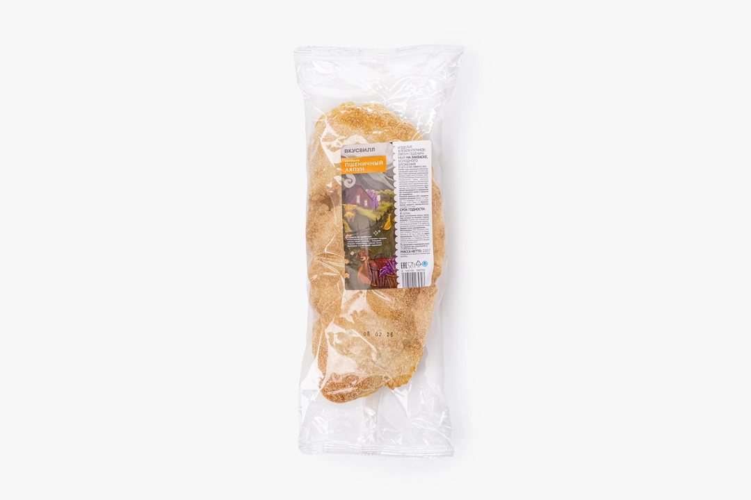 Традиционный хлеб на закваске. Тесто и закваска изготовлены из пшеничной муки высшего сорта. Лепёшка ароматная, пористая, во вкусе — кислинка и солоноватость. Она долго не черствеет, сохраняя при этом вкусовые качества. В составе нет ингредиентов животного происхождения. В 100 г продукта всего 171 ккал.