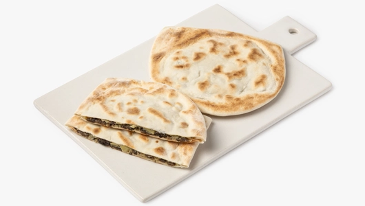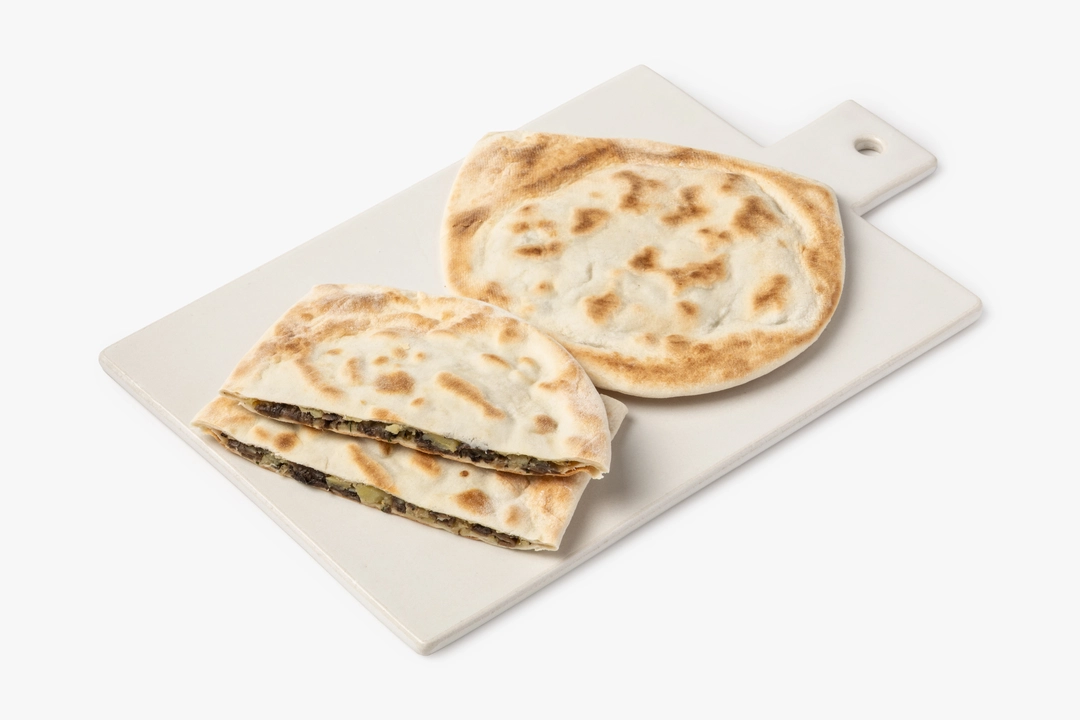 Пара пшеничных лепёшек с толчёным картофелем, сочными шампиньонами, репчатым и зелёным лучком. Хороши для сытного перекуса и в компанию к супу. Советуем немного разогреть в микроволновке или на сухой сковороде — вкус грибов и зелени станет ещё насыщеннее.