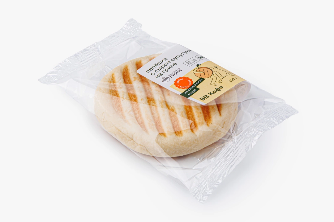 Солёный сыр сулугуни отлично сочетается с пресноватым дрожжевым тестом. После разогревания на гриле лепёшка особенно вкусная: нежная, с тающим сыром и аппетитным ароматом. Со сладким чаем или кофе — идеально. Товар доступен в магазинах с зоной кафе.