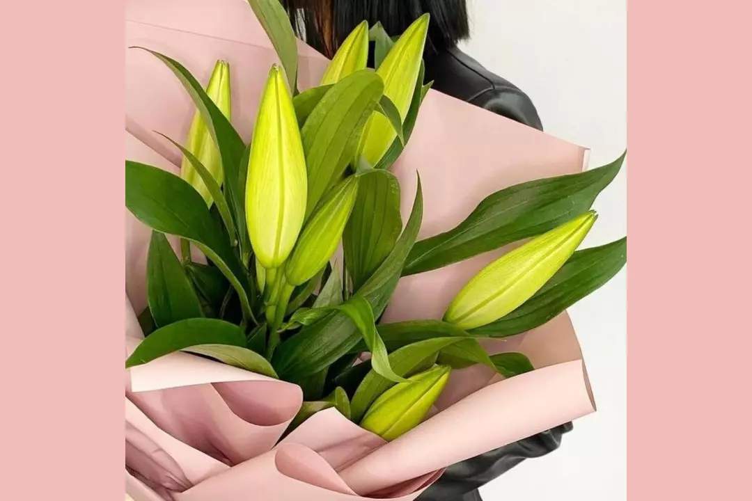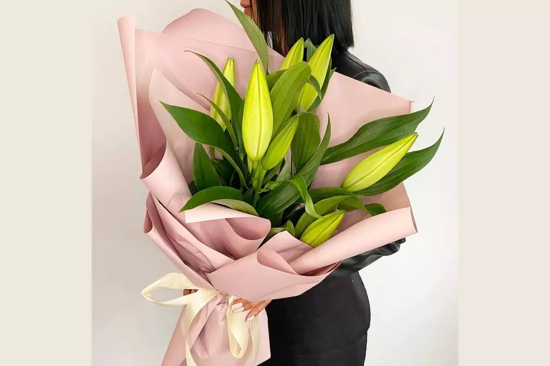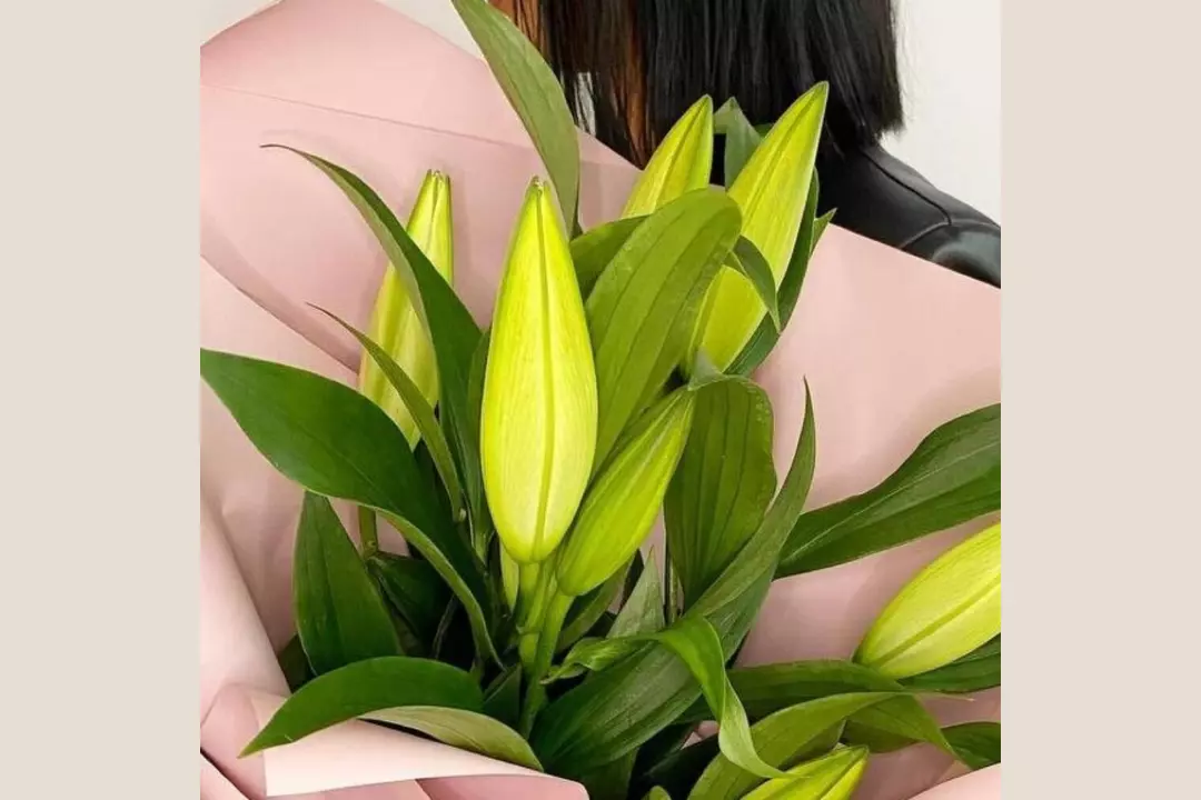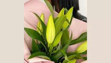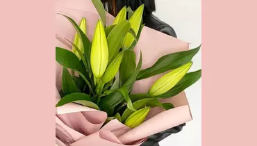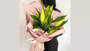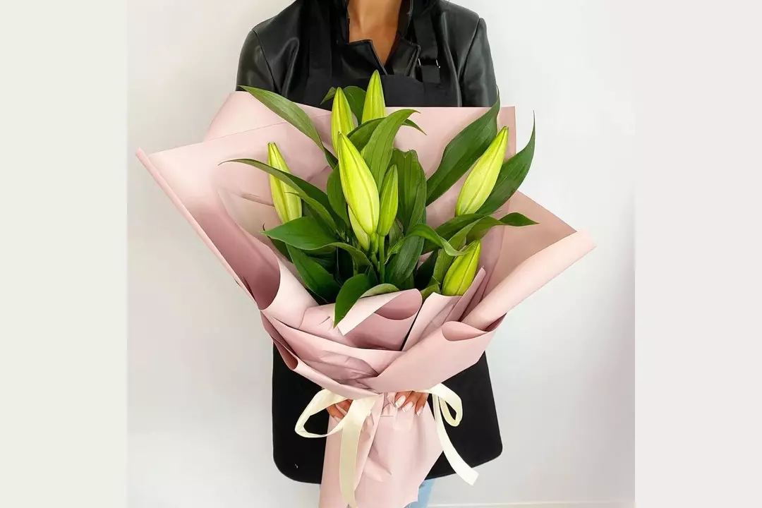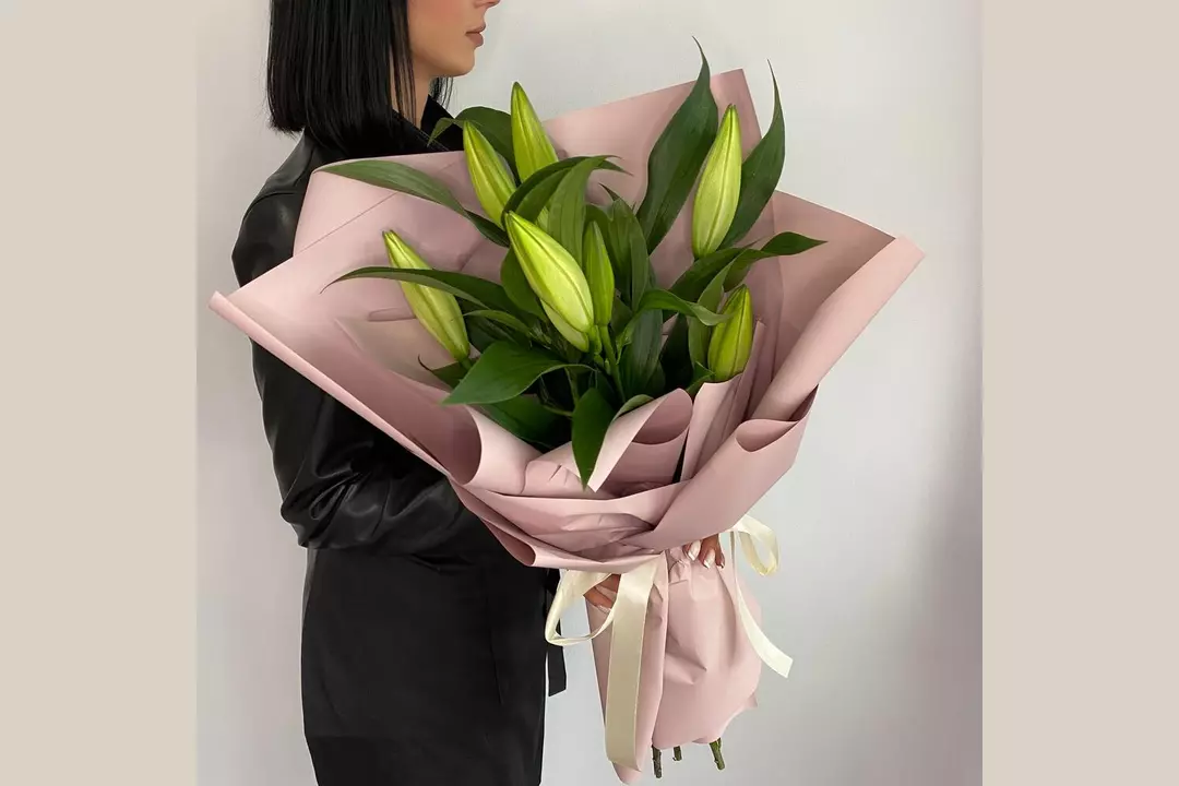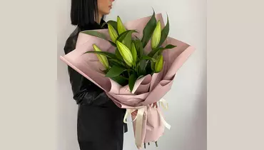Состав букета: Лилия - 3 шт. Лента атласная - 1 шт. Пленка - 1 шт. Размеры: Ширина: 30 см Высота: 40 см